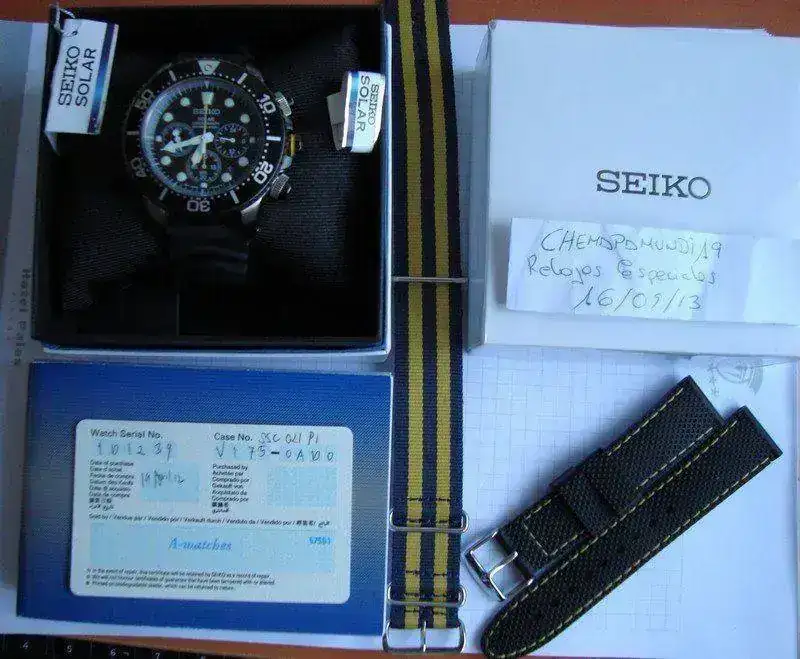 el reloj lo entrego con la dotacion completa, ambas cajas (exterior e interior), documentacion, garantia (en vigor hasta el dia 19 de abril de 2014). El reloj como veis lo entrego con su correa de caucho original seiko y ademas entrego dos correas, una de goma con pespuestes amarillos que le queda genial y otra nato tambien amarilla y azul oscura que tambien le queda bastente bien.[/font]