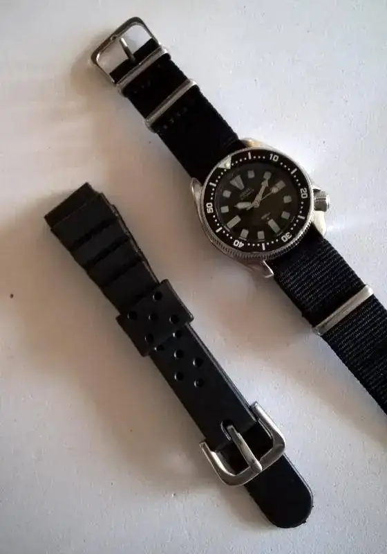 El reloj se entrega con una NATO negra sin apenas uso, y un caucho genérico similar al que venía de origen nuevo.