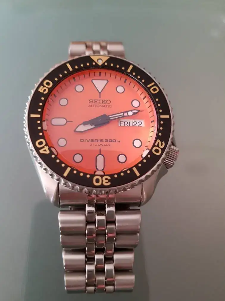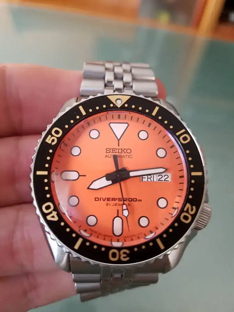 Saco a la venta este relojillo ahora que llega el verano para que algun compañero lo disfrute como se merece. Se trata de un Seiko tipo skx con la esfera naranja y las agujas a juego con la esfera . Viene con su característico y comodisimo armis jubilee seiko y también con su caucho original.