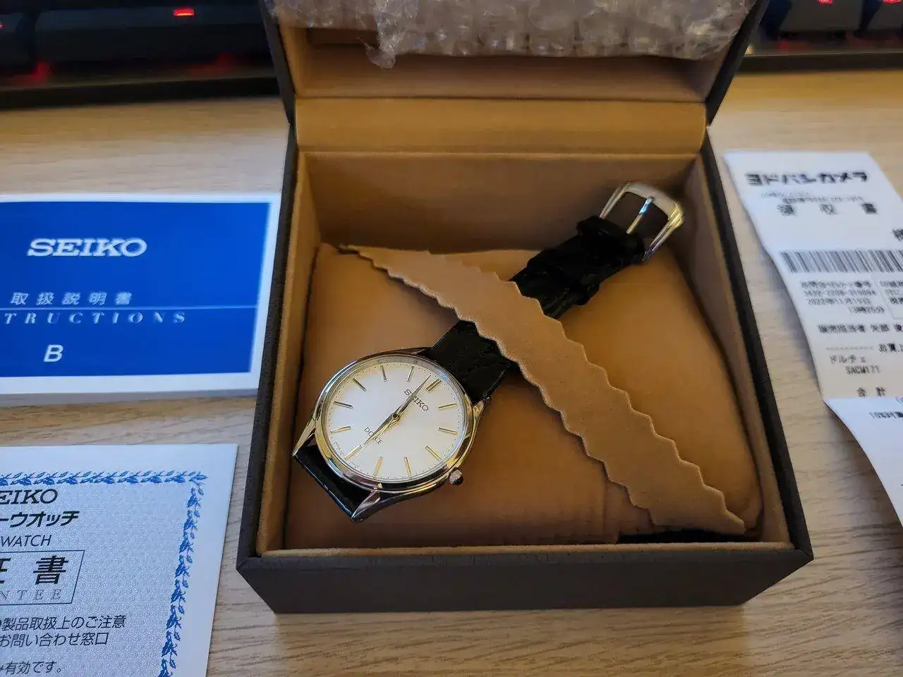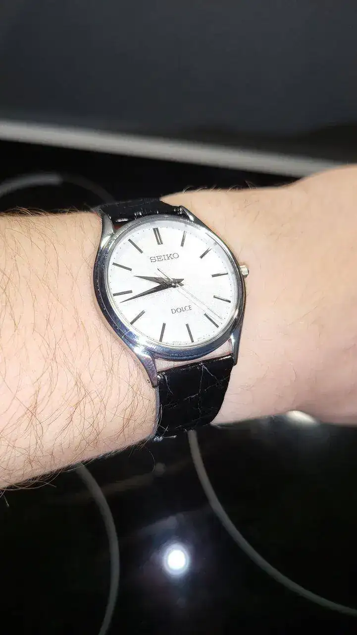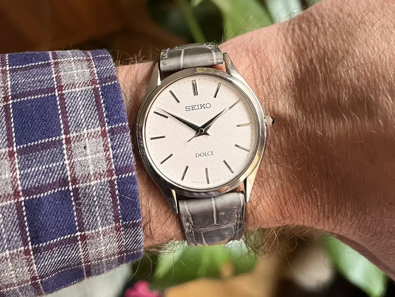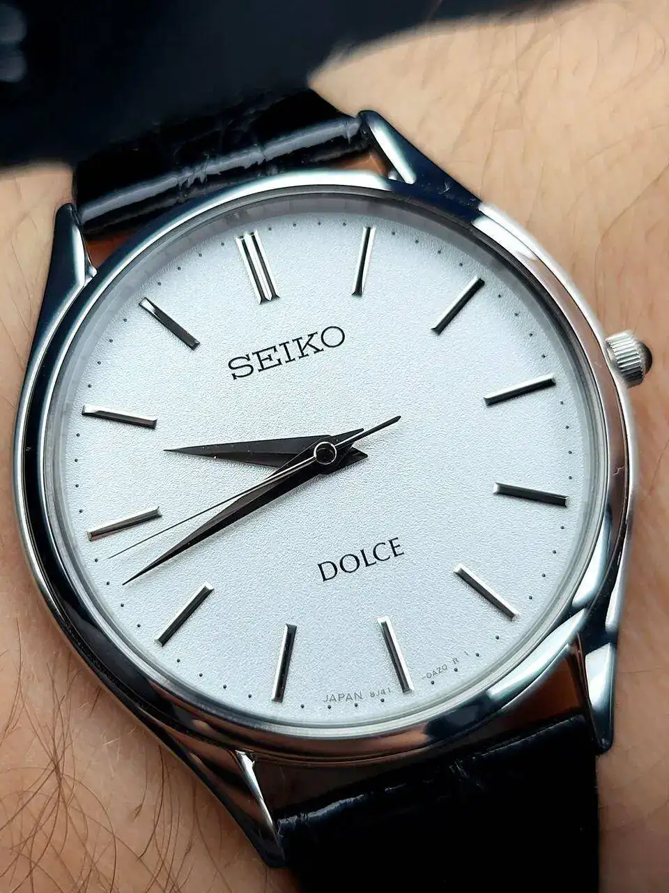 Movimiento de cuarzo termocompensado, 5 rubíes, totalmente reparable y +-10segundos POR AÑO!! Leyendo más me encontré con que era parte de la familia 8J, movimientos de finales de la década de los 90 que se usaron en los Grand Seiko y los Credor y que más adelante fueron sustituidos por por la serie 9F, que tenía más en común con la arquitectura de los 8F. Se ve que Seiko decidió que como los tenían más que amortizados y a estas alturas les salía bien barato producirlos, le iban a quitar los acabados chachis y los iban a meter en Seikos de 400€. Y ahí es donde entra mi Dolce.