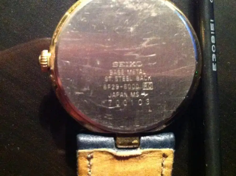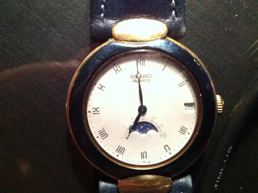 Hola a todos!!! Pues a por un segundo Seiko curioso que también es de cuarzo, con calibre 6F29. la esfera es dorada con un reborde azulado, tiene una pequeña ventana para el fechador y otra para la indicación de la fase lunar. El reloj es de diámetro 32, 34 incluyendo la corona. La correa es la original del reloj y está un poco gastada.