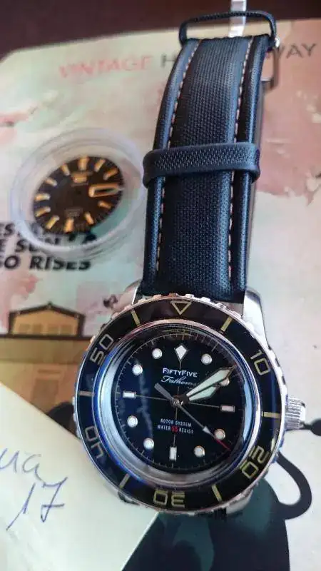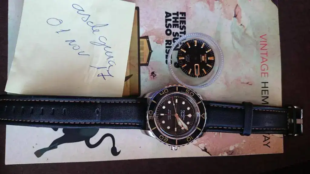 La base es el Seiko SNZH57K1 (conservo el dial y se entrega tambien) El estado es segunda mano obviamente pero IMPECABLE, es decir muy cuidado porque no ha salido mucho de paseo. La correa es de tela de barco y con agujero de más como podéis ver.