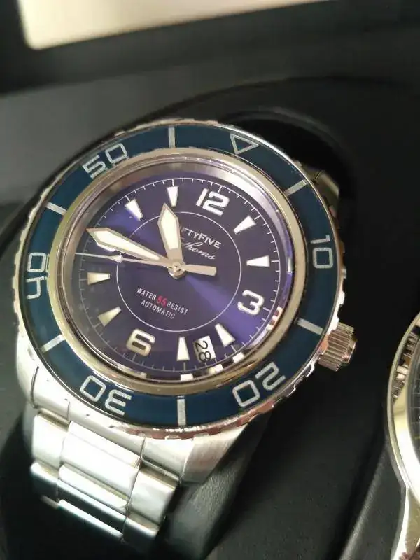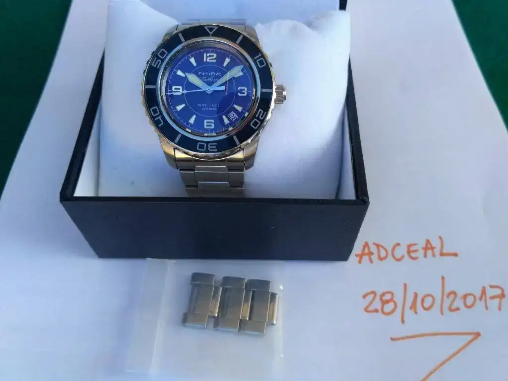 Saco a la venta este Seiko SNZH53K1 modificado a Fifthy-five Fathoms con dial de Dagaz y con Cristal de Zafiro con tratamiento anti-reflejo interior. El estado de la pieza es muy bueno, funciona correctamente y ha tenido un uso moderado, no tiene golpes en la caja ni marcas en el cristal ni bisel. El brazalete está en buen estado si bien tiene signos de uso ya que lo he usado en otro reloj. Adjunto los eslabones sobrantes.