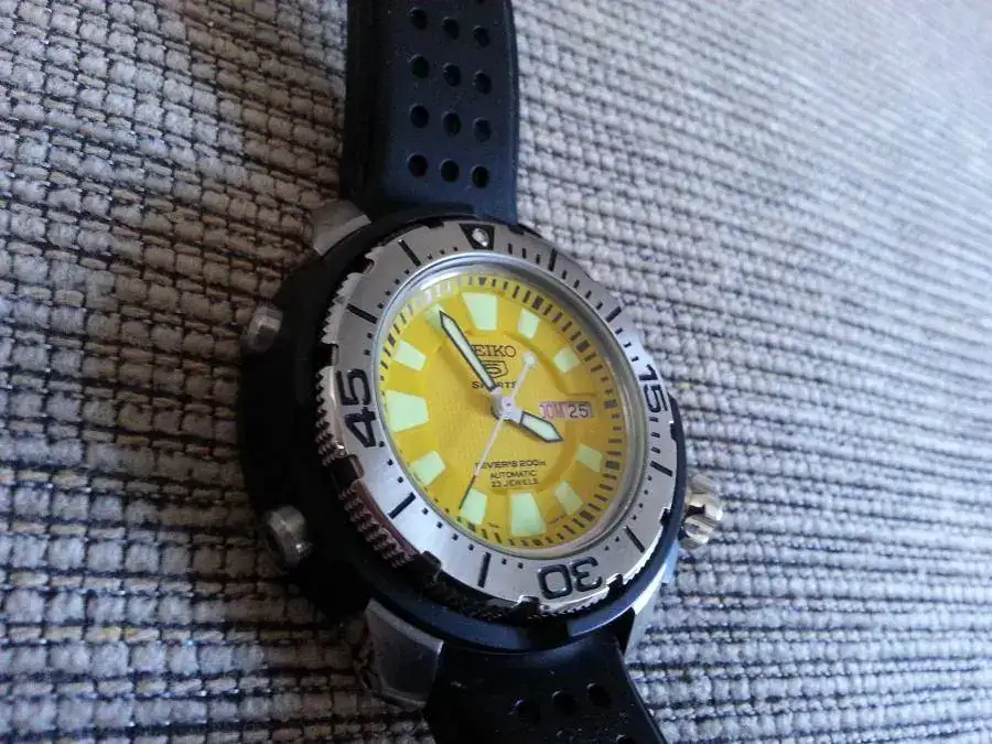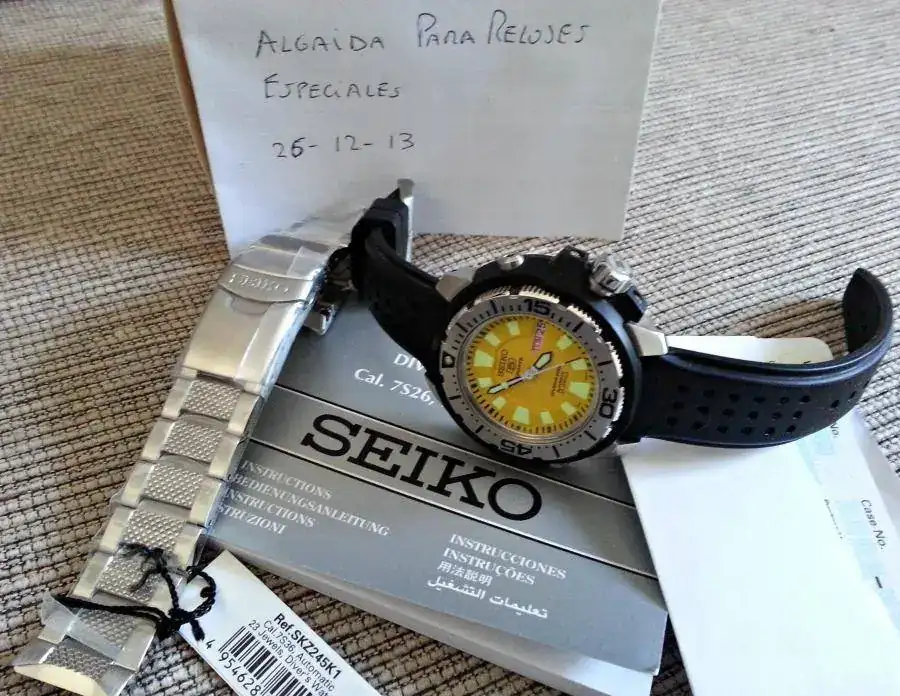 Presento para su venta esta impresionante reloj automático de buceo de Seiko. Teniendo en cuenta que me lo he puesto 3 0 4 veces su estado es perfecto,tanto es así que su armis original tiene aún puesto sus adhesivos de fábrica. Lo entrego con una correa de caucho de regalo.