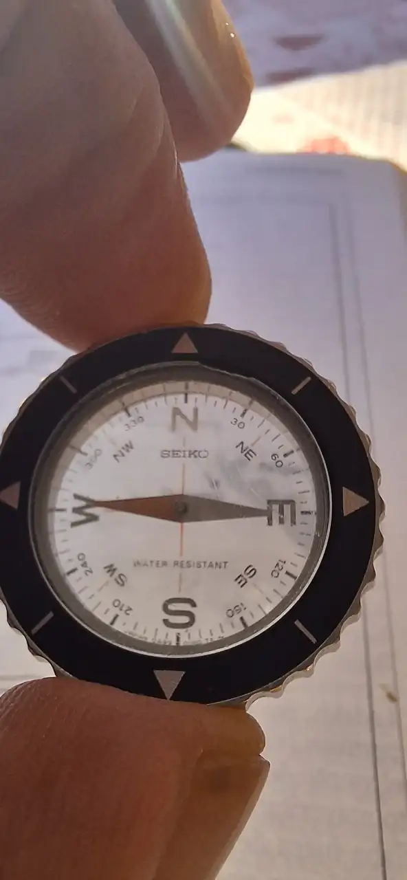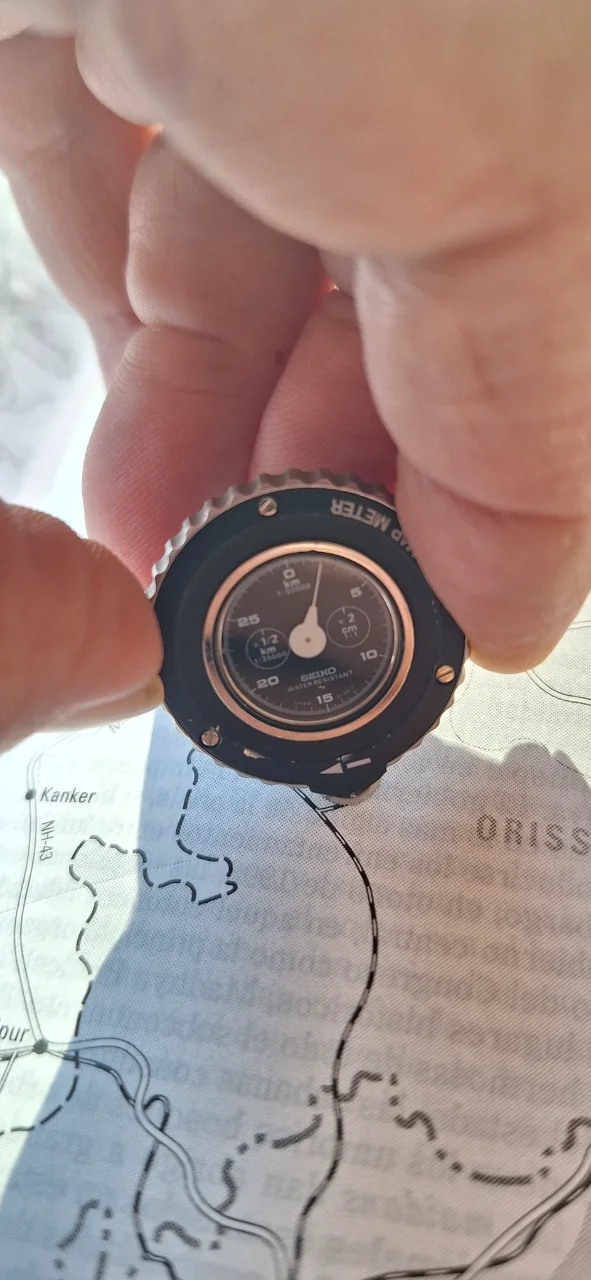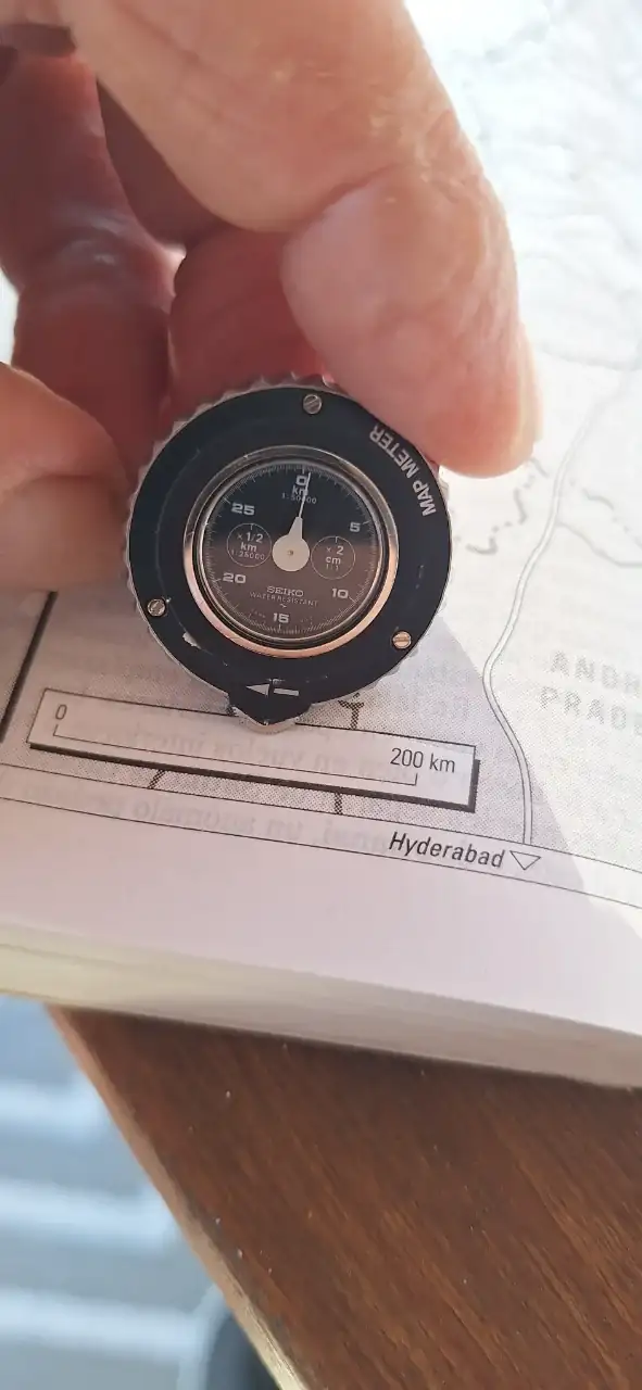 Y el módulo para medir la distancia en un mapa a escala real. Lleva una pequeña rueda que al pasarla sobre el mapa la aguja se mueve y te muestra la distancia a recorrer. Hay un video en Internet que lo explica muy bien.