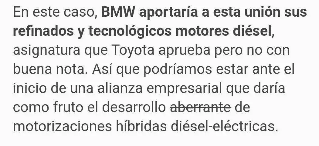 Pues no sería descabellado... Ya ha habido Toyota's con motor diesel de BMW, al igual que todas las motorizaciones del Supra. Hay que compartir gastos, que está mala la cosa.Para el siguiente video tan educativo le propongo otro tema, Toyota le hace los motores a BMW ??
