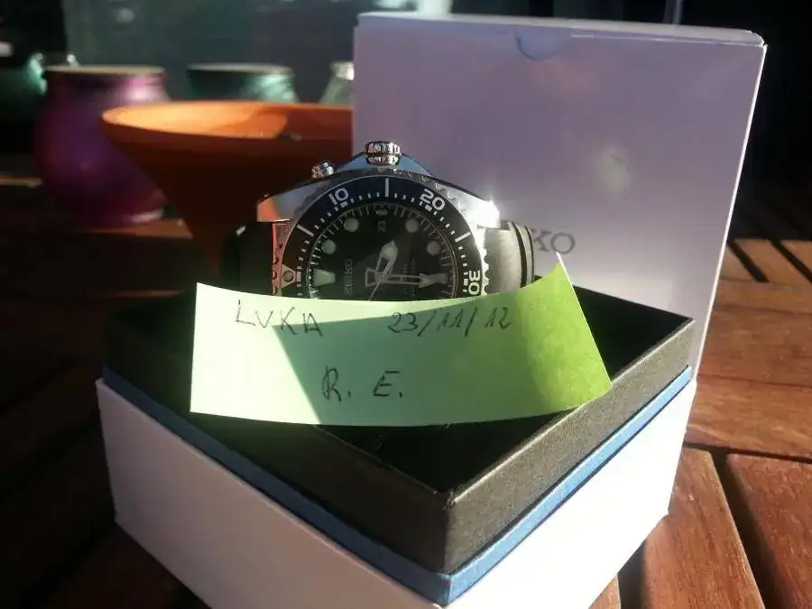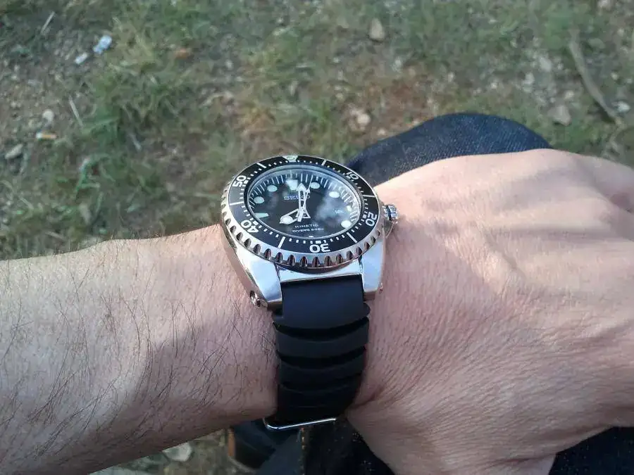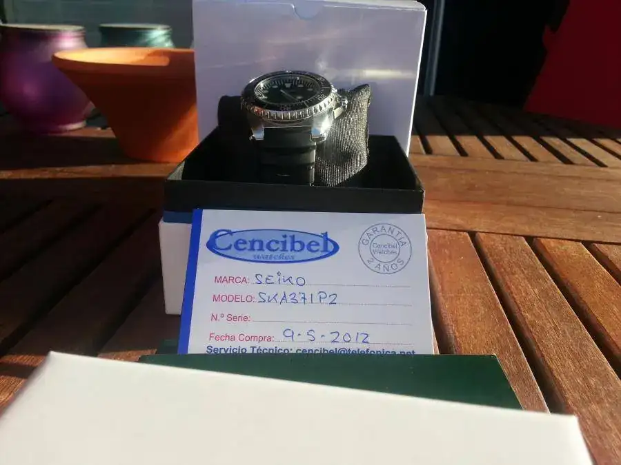 Saco sólo para la venta un Seiko Kinetic Divers SKA 371 P2, sumergible 200 metros, con correa de caucho. Todo original Seiko, adquirido el pasado mes de de mayo a un mercante de este foro, le queda por tanto casi un año y medio de garantía. El reloj tiene muy pocas puestas, solo un poco en verano. Está practicamente de reestreno, tan sólo un pelin en el bisel a la altura del 16, pero practicamente inapreciable (soy incapaz de sacarlo en las fotos)....por lo demas el reloj está inmaculado. El calibre es el famoso 5m62 de Seiko que acumala bateria hasta seis meses a plena carga. La medida es de 42 mm de esfera y 13 mm de ancho.
