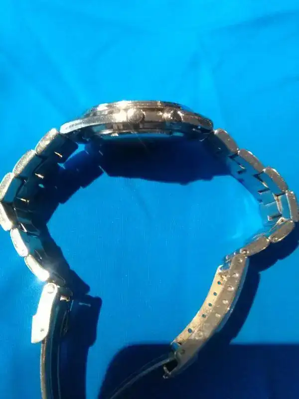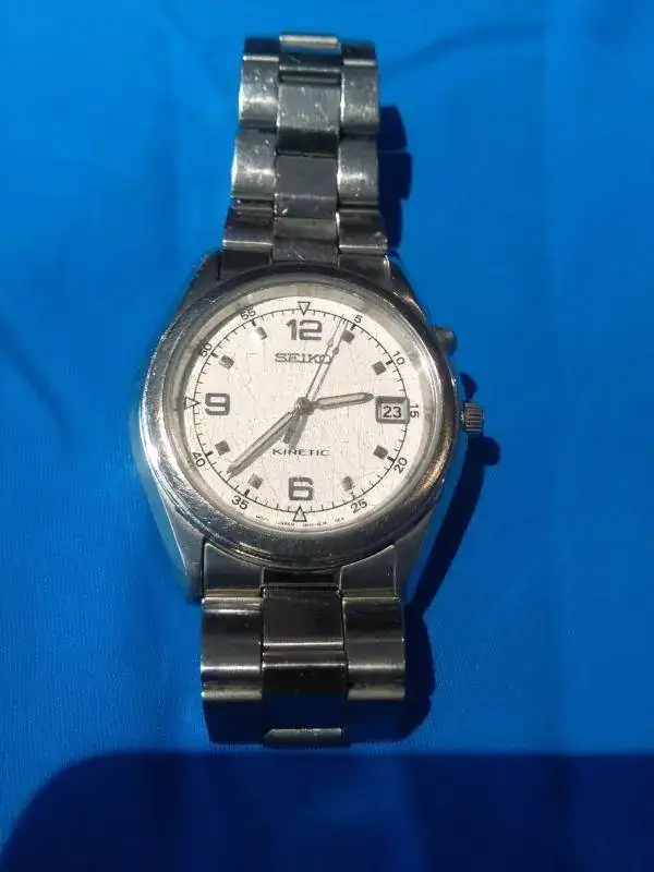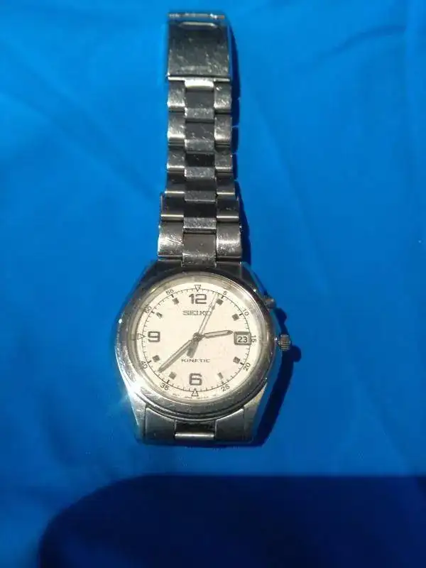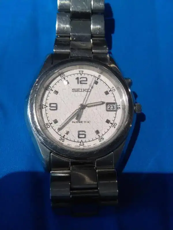 Seiko Kinetic usado y con marcas propias de el. Ha estado mucho tiempo parado y la bateria no esta en buenas condiciones. No obstantes lo agitas un segundo y mantiene bien la hora con los inevitables saltos del segundero de dos en dos.