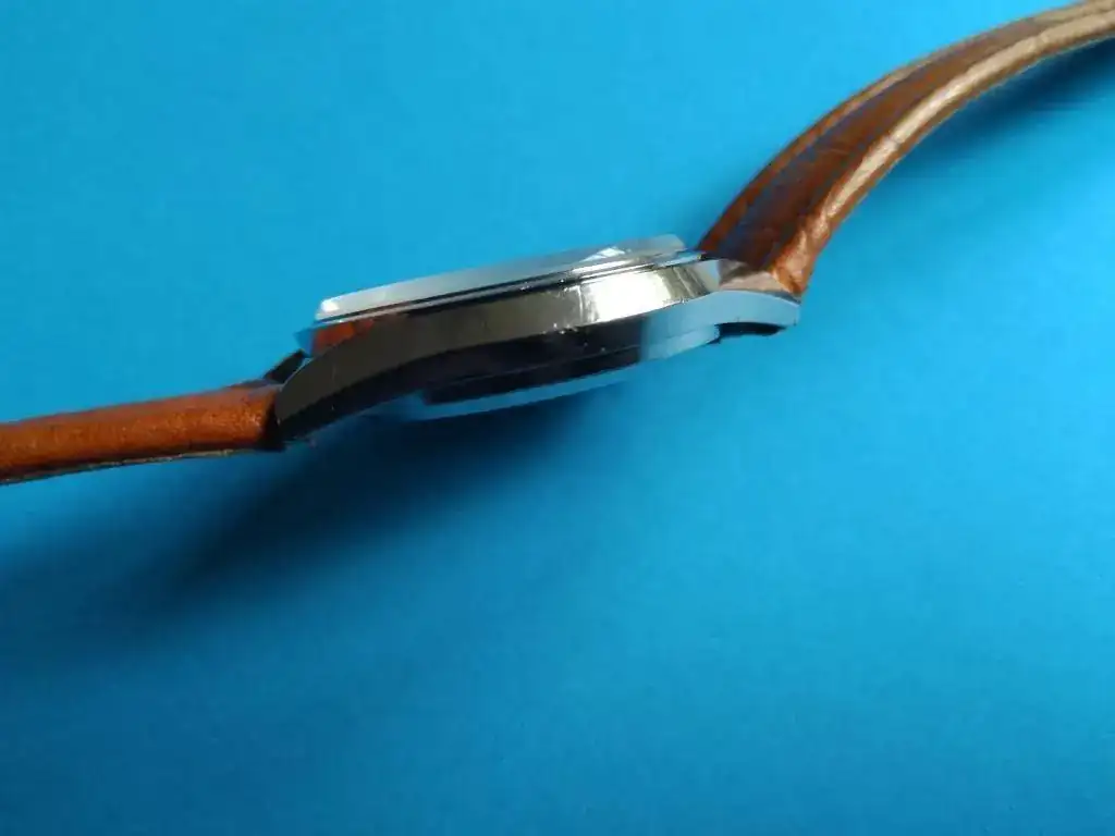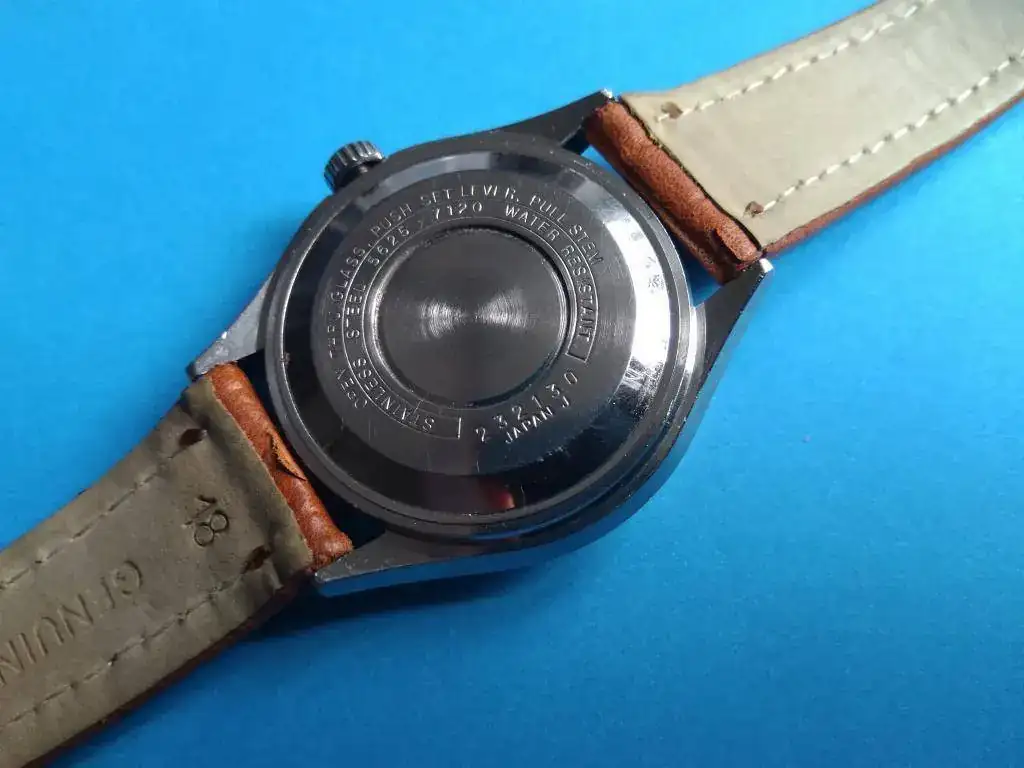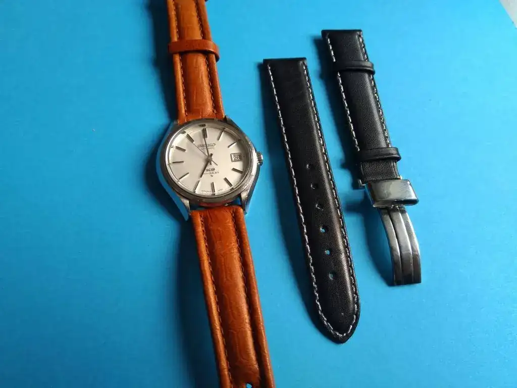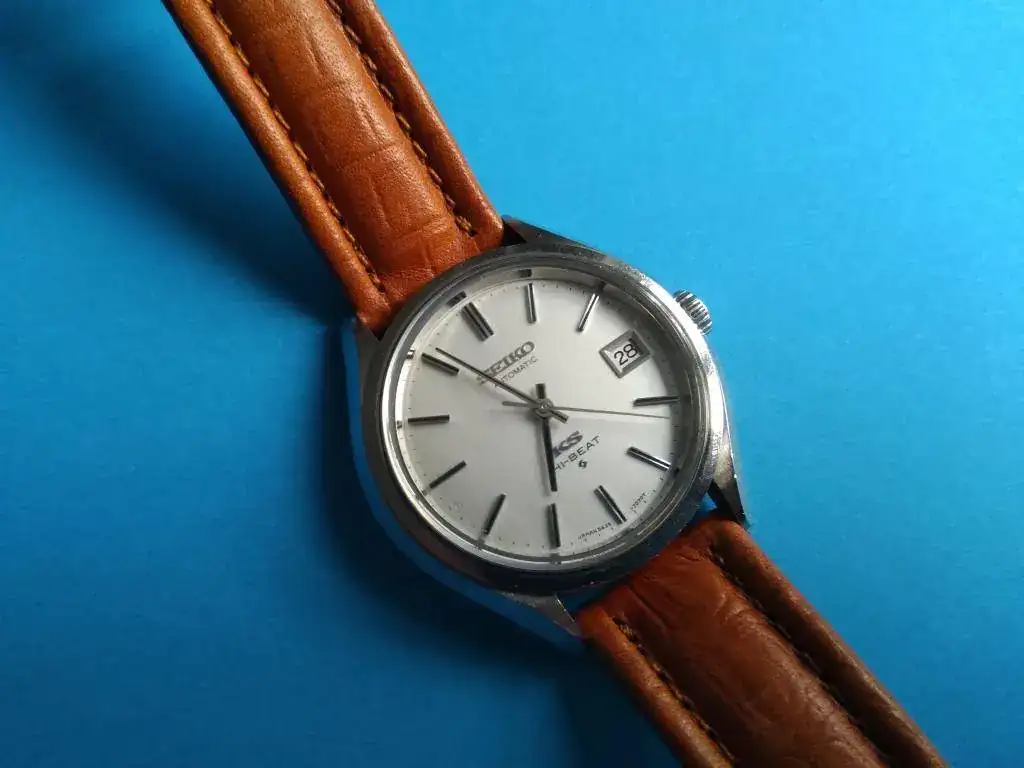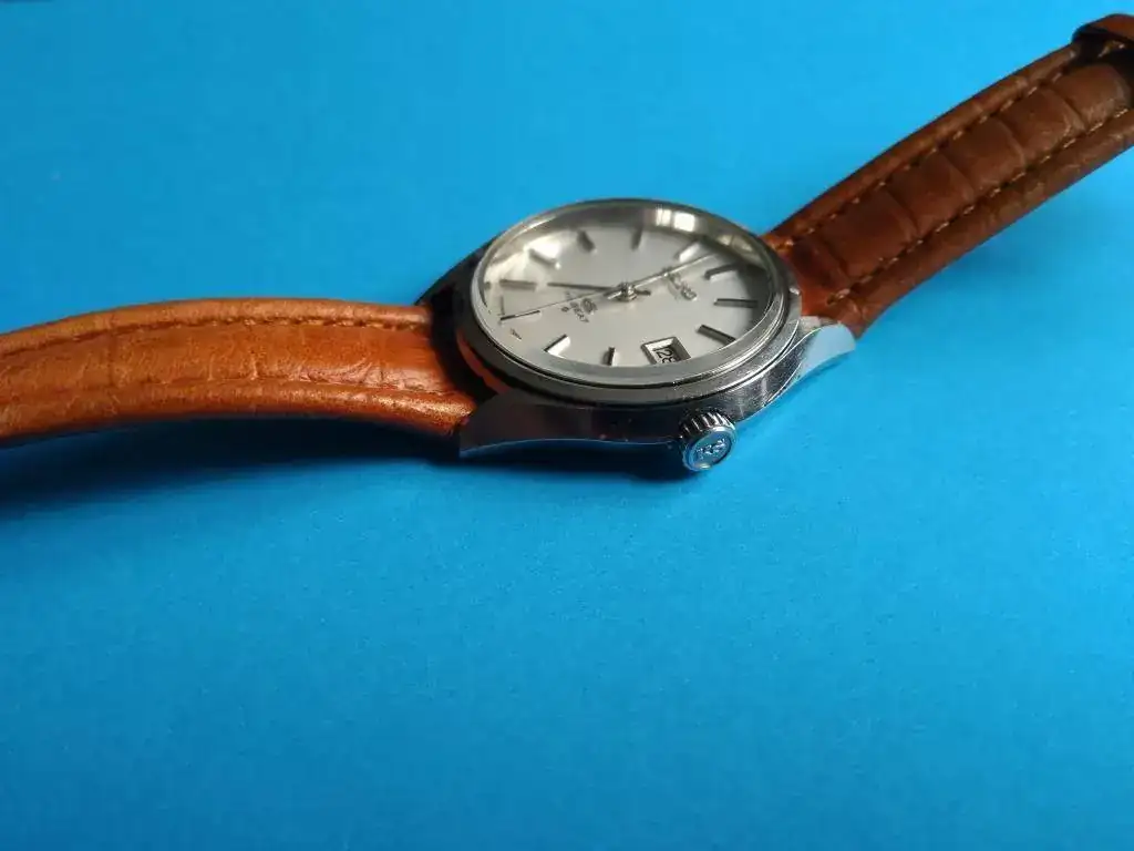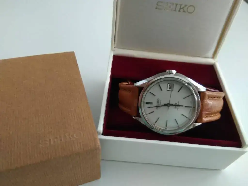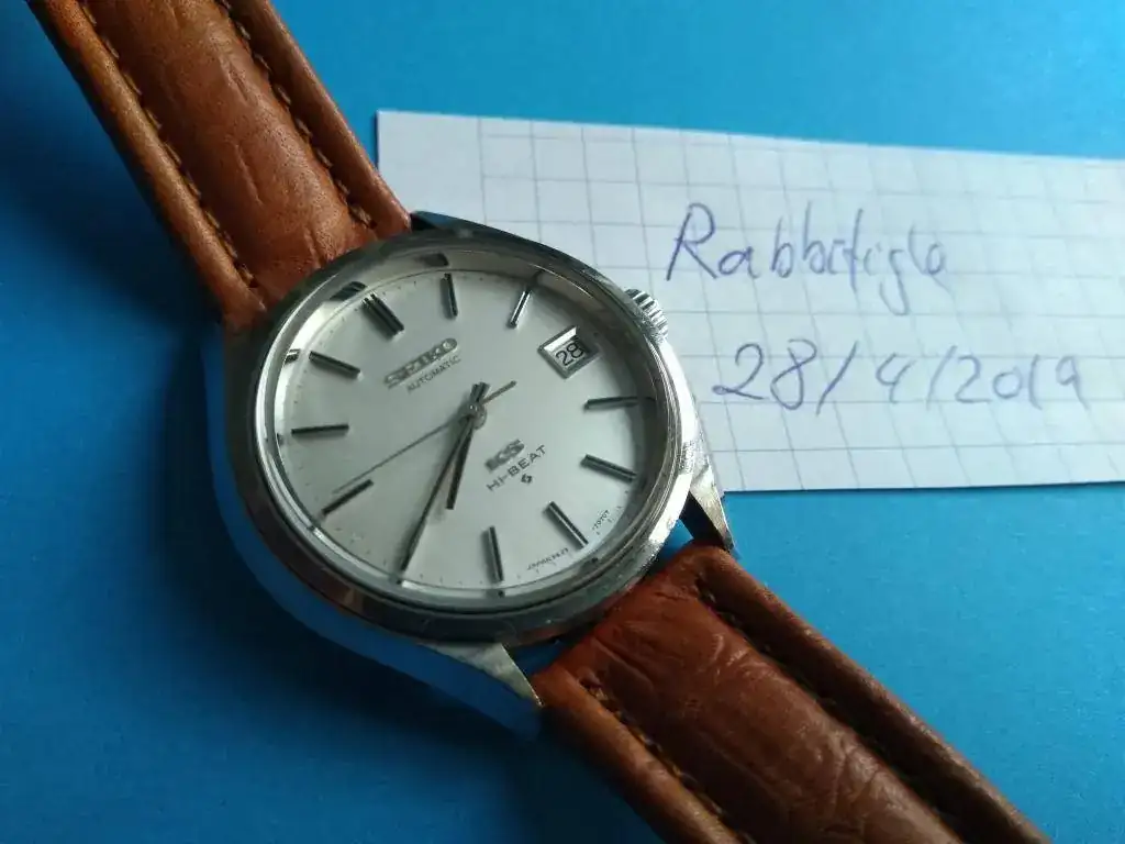 Es un King Seiko Hi-Beat de Marzo de 1972 (como yo, por eso lo compré). Funciona perfectamente, recién reparado en HoraExacta por que dejó de funcionar el pase rápido de fecha. Está en un estado realmente bueno para sus 47 años aunque muestra ligeras marcas de uso. Corona firmada no-roscada, regalo correa de piel a solutamente a estrenar. Falta el "medallón" dorado que debía ir en el centro de la parte trasera de la caja (monobloque).
