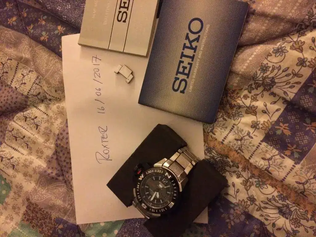 El Armis está ajustado a muñecas de 18-19 cms. Se entrega un eslabón más sin pasador. También lleva su caja original, manual de instrucciones y tarjeta de garantía sin sellar.