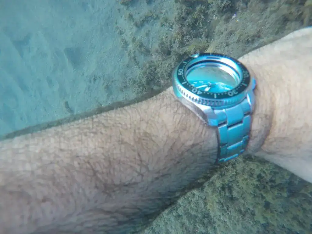 Hacía ya bastante que no se mojaba, siendo mi reloj preferido. Así que ayer y hoy se meterá al mar Me encanta verlo bajo el agua