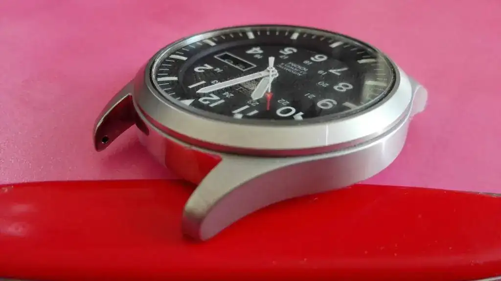 Esta en muy buen estado, tiene algún arañazo en asas y en bisel en un par de zonas, en laterales no veo nada. En cristal mirando en su angulo se puede ver un pico sobre el centro y arañazo superficial en lateral entre las 2 y las 3. En la trasera no veo nada.
