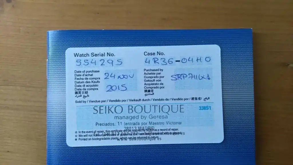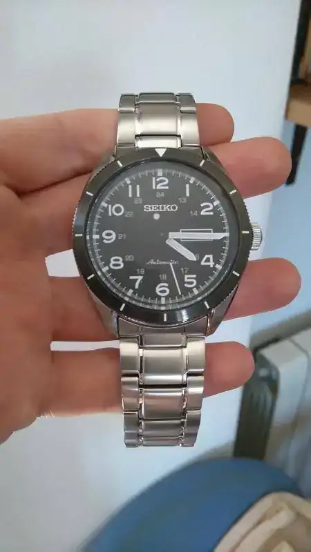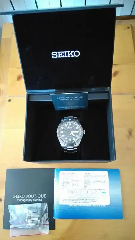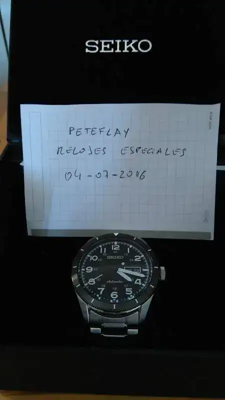 Siguiendo con la "operación limpieza" pongo a la venta este Seiko Military SRP711K1, comprado en la Boutique de Madrid el pasado noviembre, con lo que aún le queda garantía por delante. Lo vendo porque no lo uso (a pesar de que me encanta), a lo sumo me lo habré puesto unas cuantas veces y ya, así que está impoluto. Monta al conocido movimiento 4R36 de Seiko, con remonte manual, parada de segundero y 42 horas de reserva de marcha. En el poco tiempo que lo he llevado no he apreciado que se desviara más de 10s/día, con lo que es un muy buen ajuste para esta calibre. El armis es cepillado con pequeños eslabones pulidos y los eslabones son macizos. El cristal es Hardlex abombado. Por lo demás, lo acompaño de la caja original, tarjeta de garantía (en vigor) y manual de instrucciones.