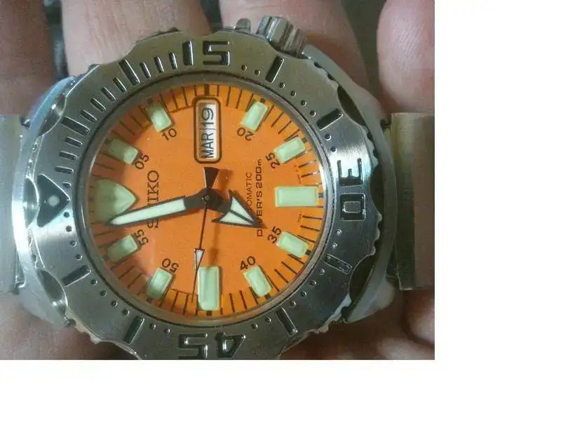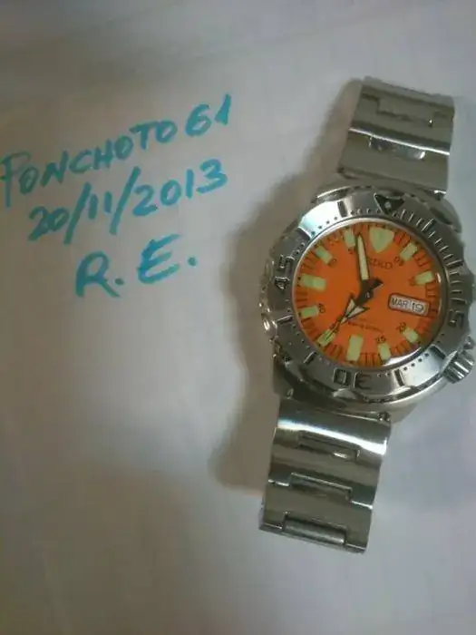 Hola, saco a la venta mi Seiko Monster comprado en julio de este año, con casi toda la garantia por delante, sus características son de sobra conocidas en el foro, solo recordar que su caja es de acero de 42 mm, bisel unidireccional, cristal convexo antirreflejos hardex impoluto, dial naranja con gran luminiscencia, armis de acero con extensión de buceo, WR 200 m., corona roscada, y no tiene ningún golpe ni marcas significativas, solo los típicos pelillos del uso, facilmente eliminables. Calibre automático 7S26 (21 Jewels). El precio que fijo para esta pieza es de 140€ envio incluido por correo certificado, con su caja y documentación.