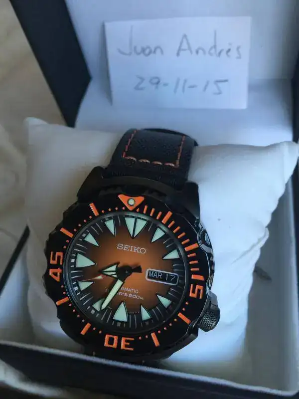 Lleva una correa de nylon negra y naranja e incluye otras dos: su armis negro original Seiko y una NATO naranja.