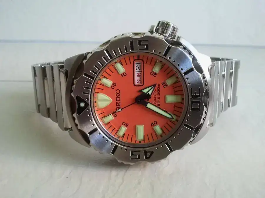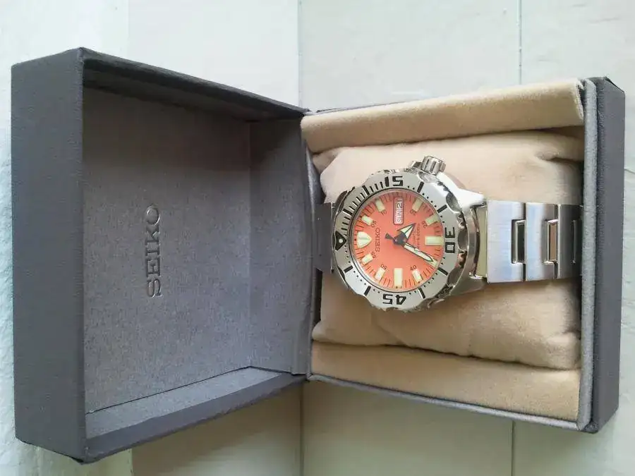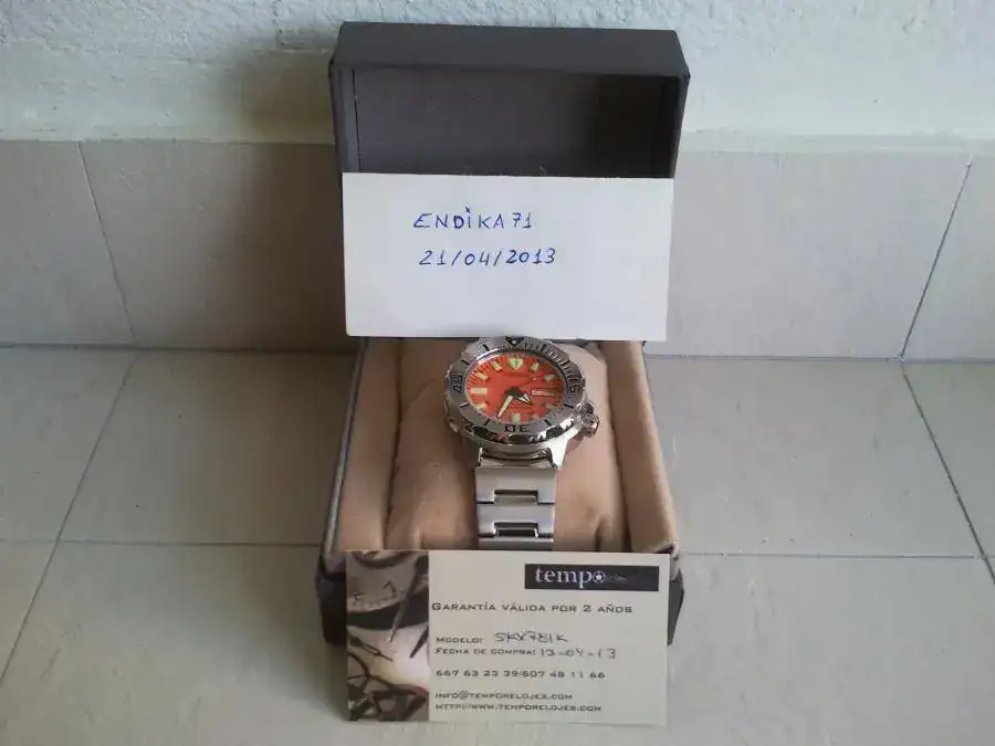 Hola compañeros. Saco a la venta este Seiko monster oranghe, sobradamente conocido por todos los foreros. Esta comprado hace una semana a Mutter a traves de su pagina webTempoRelojes. Tengo la version en negro y queria probar el naranja para el verano. Me lo probe en casa y vi que el naranja no era lo mio. No tiene ni el armis ajustado. El que se lo lleve lo estrena. El precio, 160 euros con portes incluidos a la peninsula. Hace una semana pagué 185 + 13 de envio= 198. Asi que creo que el precio esta bien para un reloj nuevo.