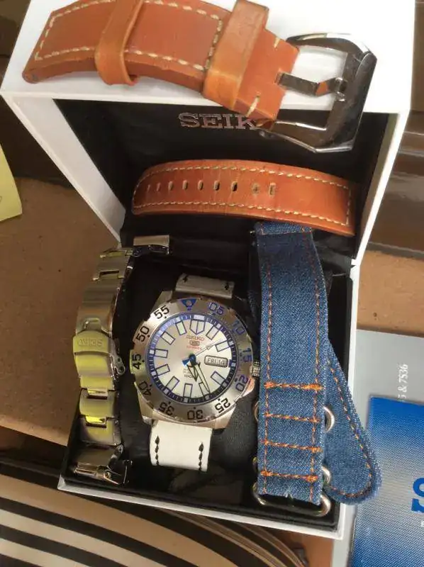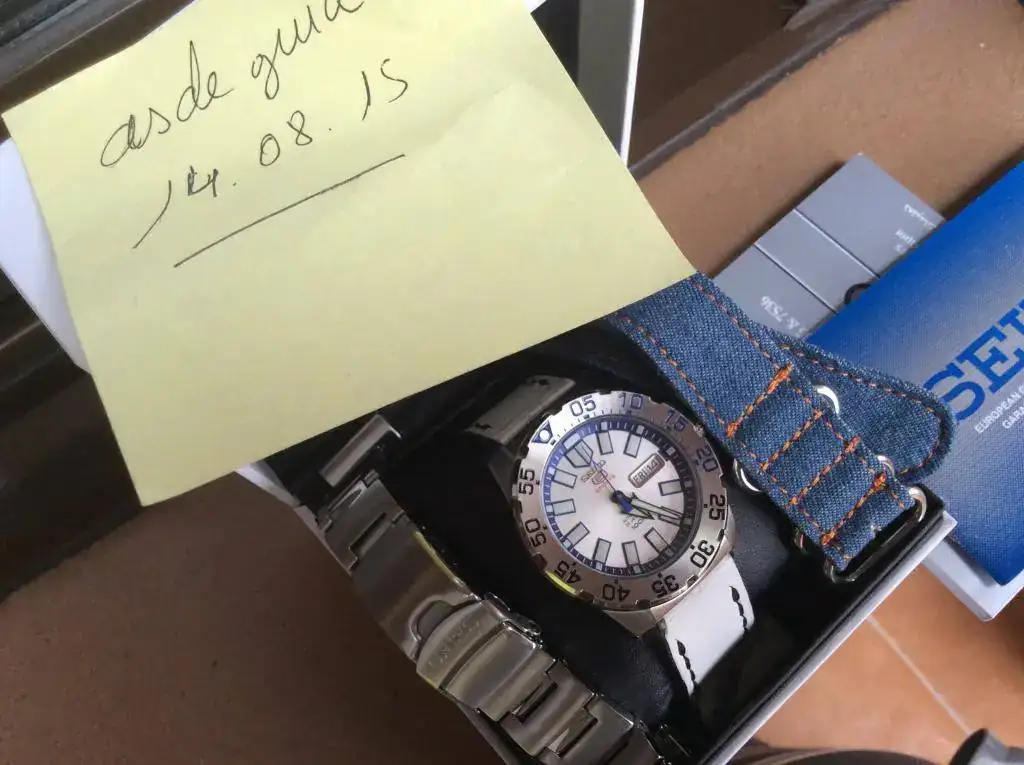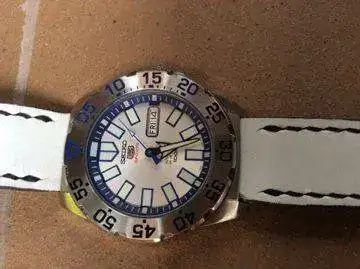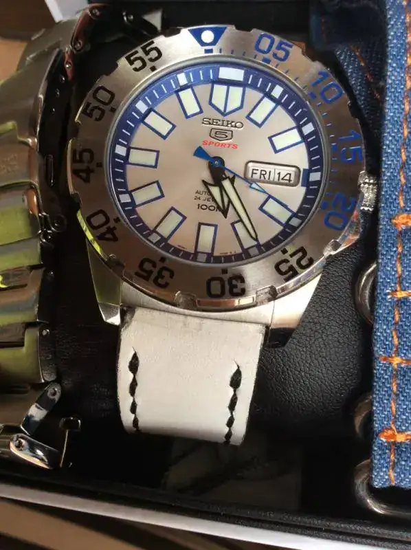 Una blanca artesanal de Market Strap (Trilanova) en blanco con una marquita o "scracth" en el extremo se puede ver en la foto a la altura del nº 35 en el bisel, pero en conjunto le va muy muy bien.