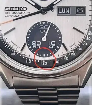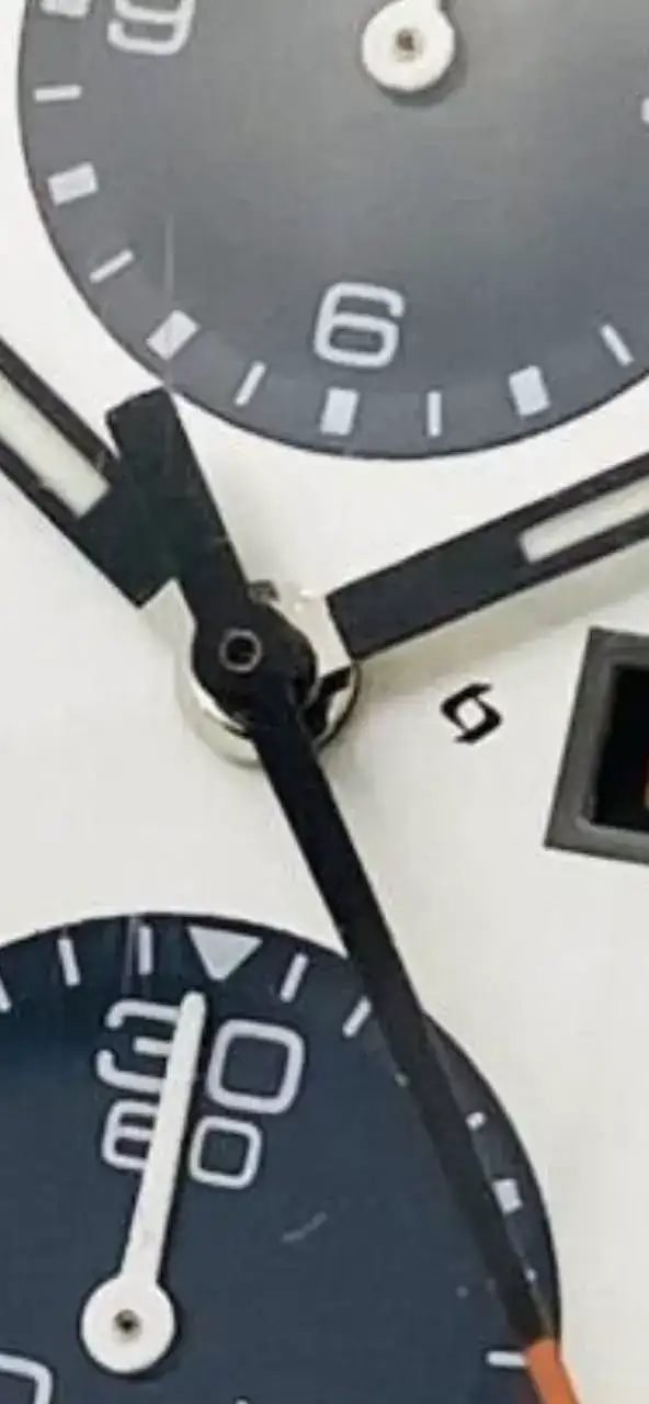 La leyenda “Chronograph Automátic”. Aquí te puedes fijar en las “O” de Chronograph. Cuando tienen forma de “huevo” (estrechas), el dial es falso. En los originales las O son mucho mas gorditas, más redondas. Y en el “OMA” de Automatic, como es el caso del que muestras, las letras están mucho mas juntas de lo normal en los no originales. Fíjate en la distancia de las O con el resto de letras del Chronograph, y la distancia que hay con la M en el “Automatic”. Están muy juntas. En los originales suelen tener la misma separación que el resto de las letras.