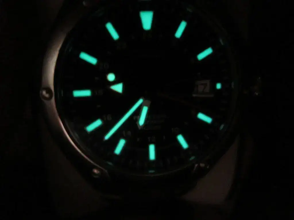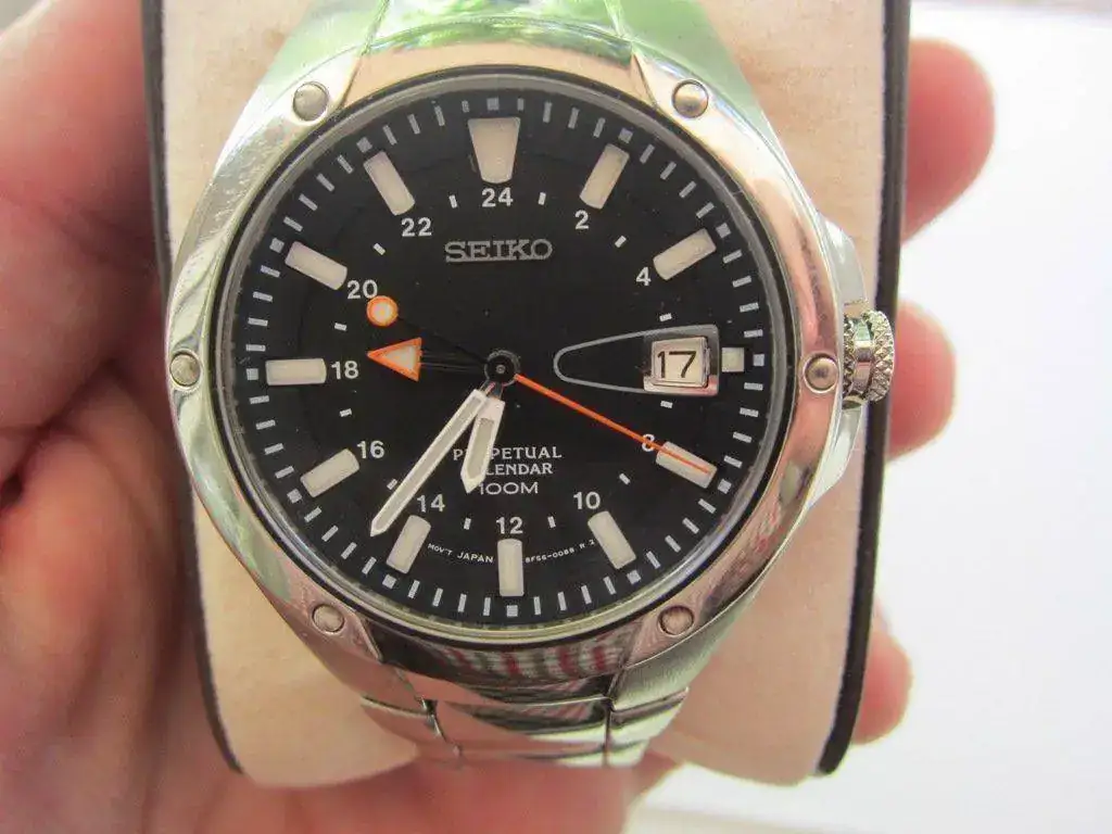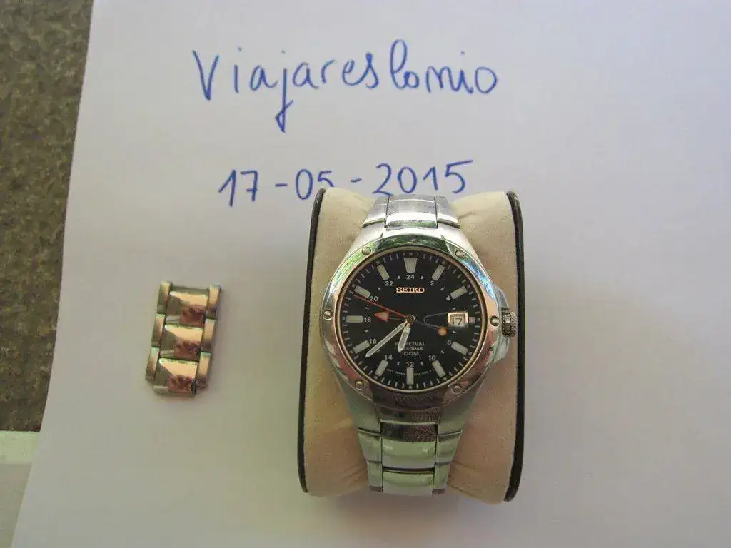 Pongo a la venta este Seiko Perpetual Calendar GMT con un movimiento gran movimiento de cuarzo 8F56 (con una precisión de +- 15 sg/AÑO). El reloj funciona perfectamente y tiene la pila (dura 10 años) cambiada hace un par de semanas (me costó cambiarla 20€). El armis tiene las rayaduras típicas de los años de uso (durante mi primera época de aficionado a los relojes era el único que tenía) pero que con un cepillado, incluso casero, creo que quedaría perfecto. Tanto el cristal que es de zafiro como la caja están en perfectas condiciones. Como podéis ver conserva perfectamente la buena luminova.