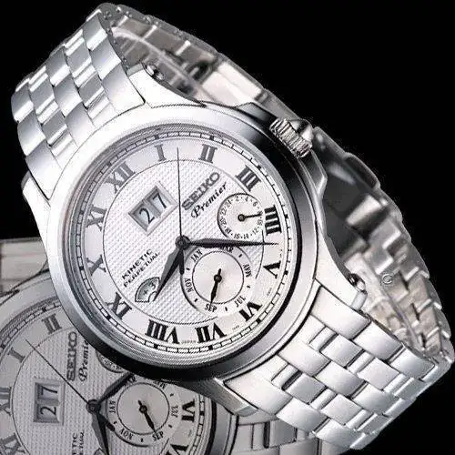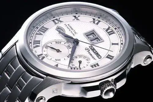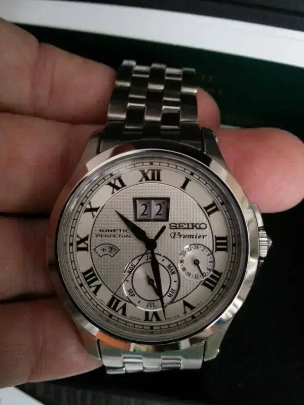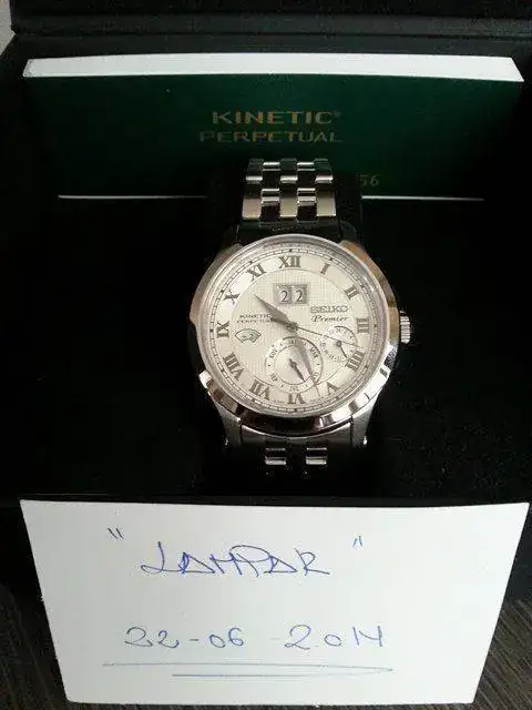 Toca el turno a este precioso SEIKO PREMIER KINETIC Perpetual Calendar, con esfera blanca y brazalete de acero, completamente nuevo a estrenar, con sus 2 años de garantía por delante, sus plásticos de protección como veréis en la fotos, y toda su daotación ( caja, garantía, manual, etc. )