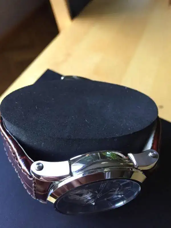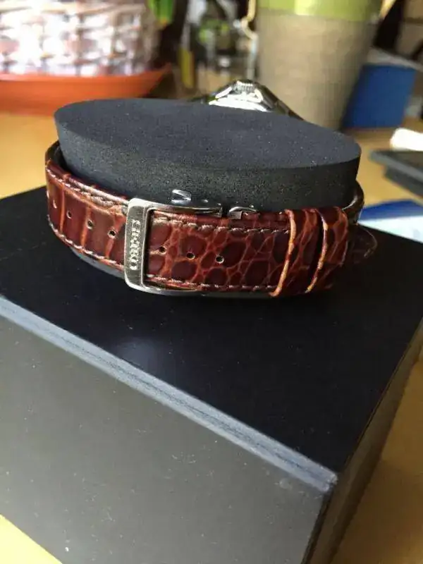 Su estado es muy bueno, como indicó ha tenido muy pocas puestas, la correa es la original, nunca se ha cambiado y se pueden apreciar algunos pelos en el lateral de apoyarlo en la mesa cuando trabajo con el portátil y obviamente en el cierre deployante. El cristal es de zafiro y esta impecable. Diría que el reloj está de 9 sobre 10.