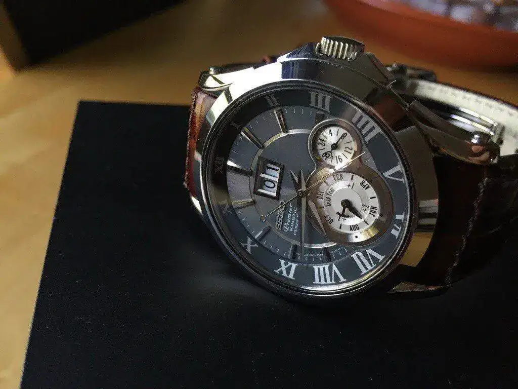 Se trata de un Seiko Premier Perpetual con movimiento Kinetic, referencia SNP025 con el que a mi parecer es el dial más bonito de los fabricados para esta versión, el gris ceniza que cambia su tono con la incidencia de la luz.