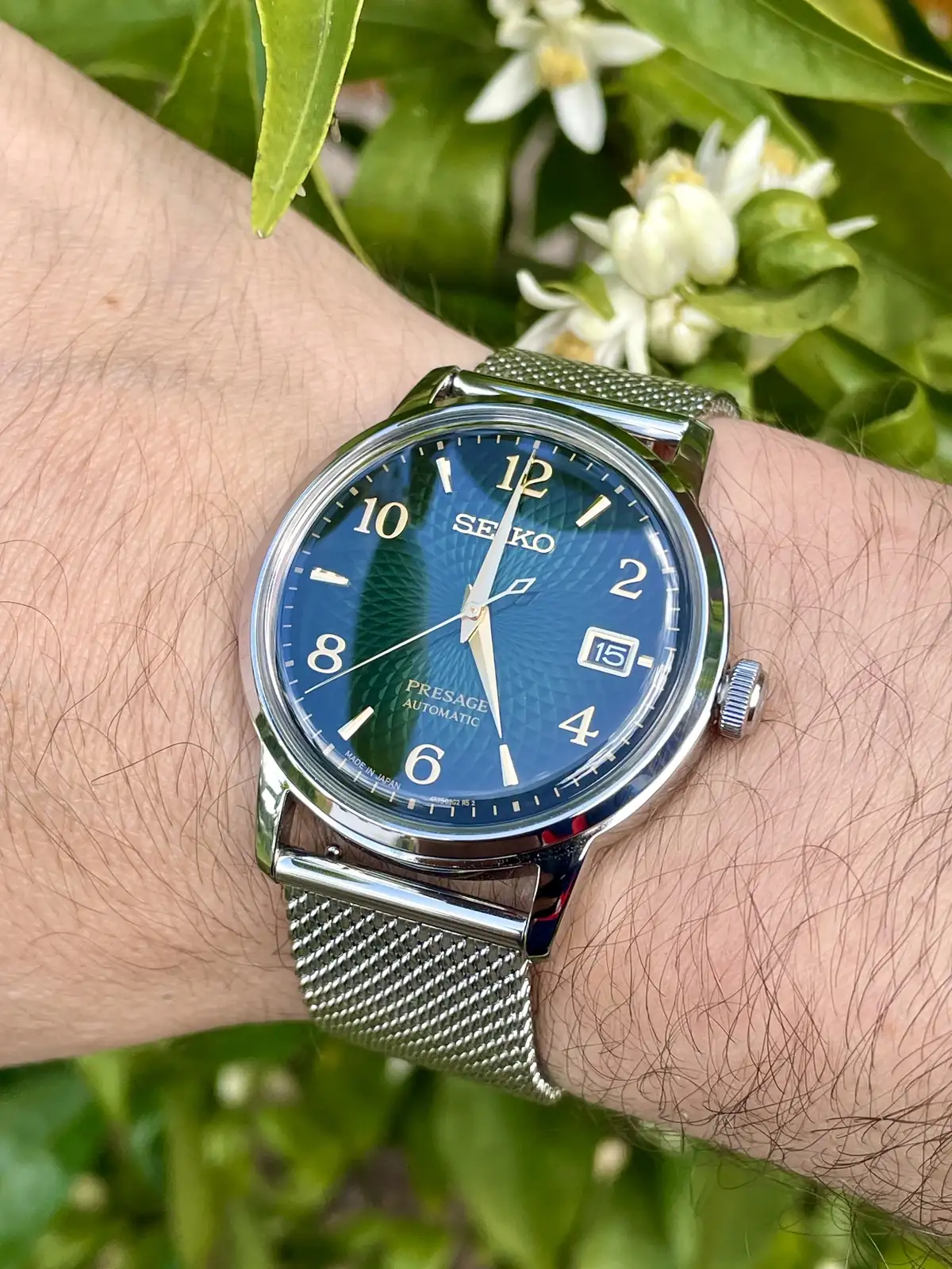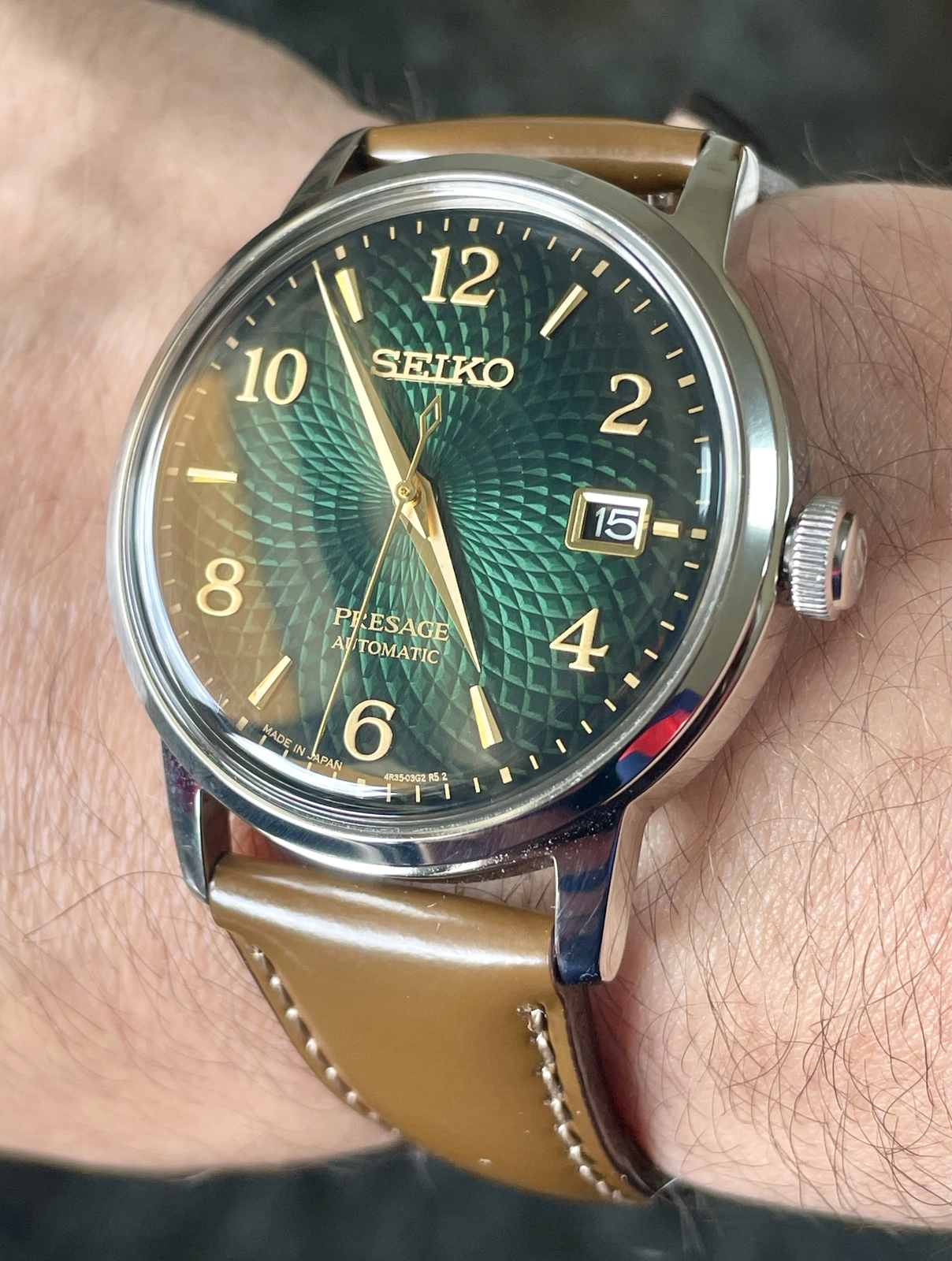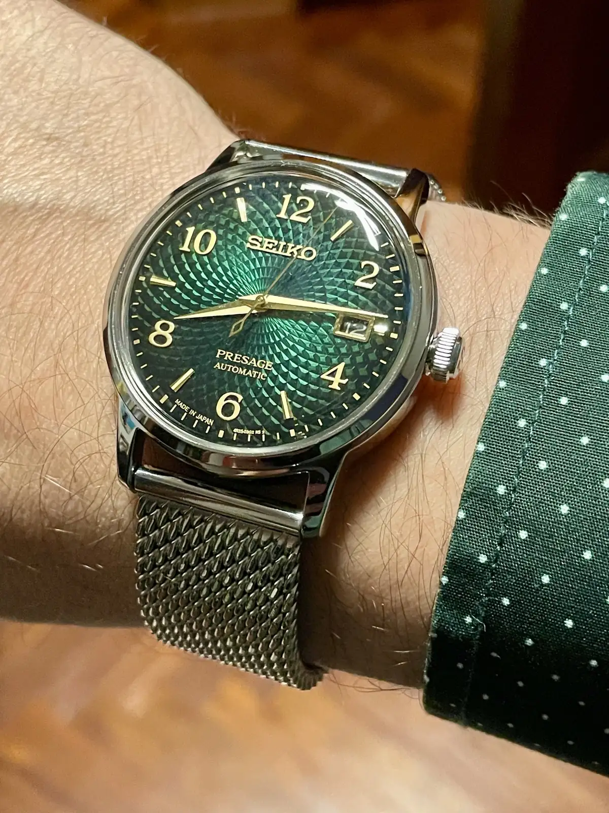 Y así paso la primera tarde de prueba combinándolo con una camisa y zapatillas de tonos verde oscuro, realmente este modelo impresiona mucho en directo y es difícil hacerle fotos donde se observe correctamente la belleza de esfera y de las líneas del mismo, se agracede la corona firmada con la S de SEIKO y el cristal abombado mineral le da un toque de personalidad brutal, los 38,5mm no se hacen pequeños para nada y el lug to lug hacen de este PRESAGE un modelo comodisimo de llevar con una legibilidad muy buena y una sensación de estilo muy acentuada, relación calidad precio pocos relojes tienen esta presencia y esta esfera brutalmente hipnótica 💚