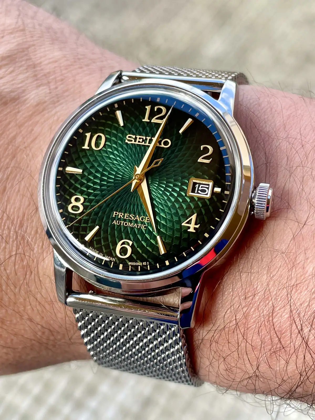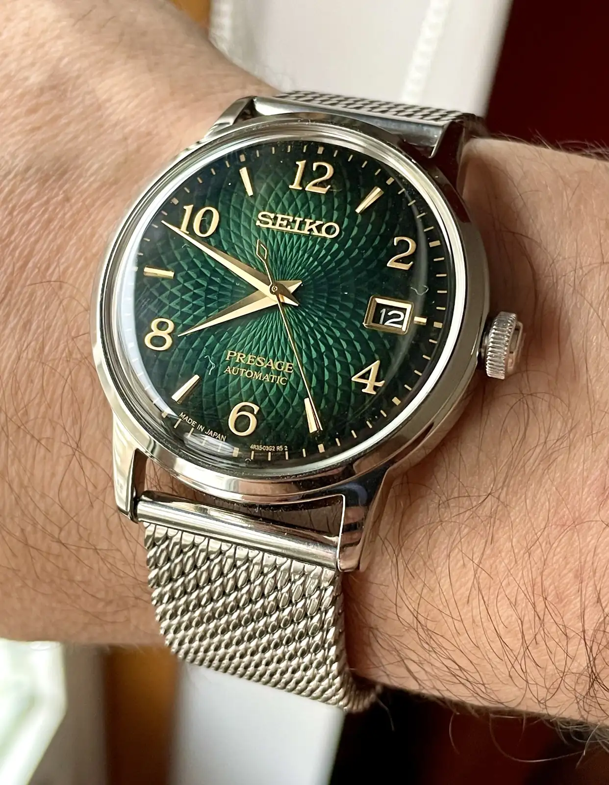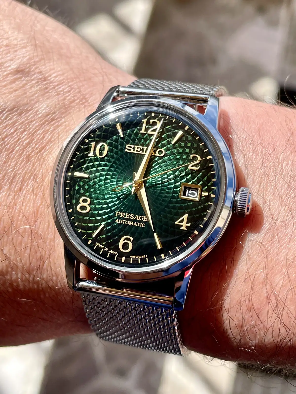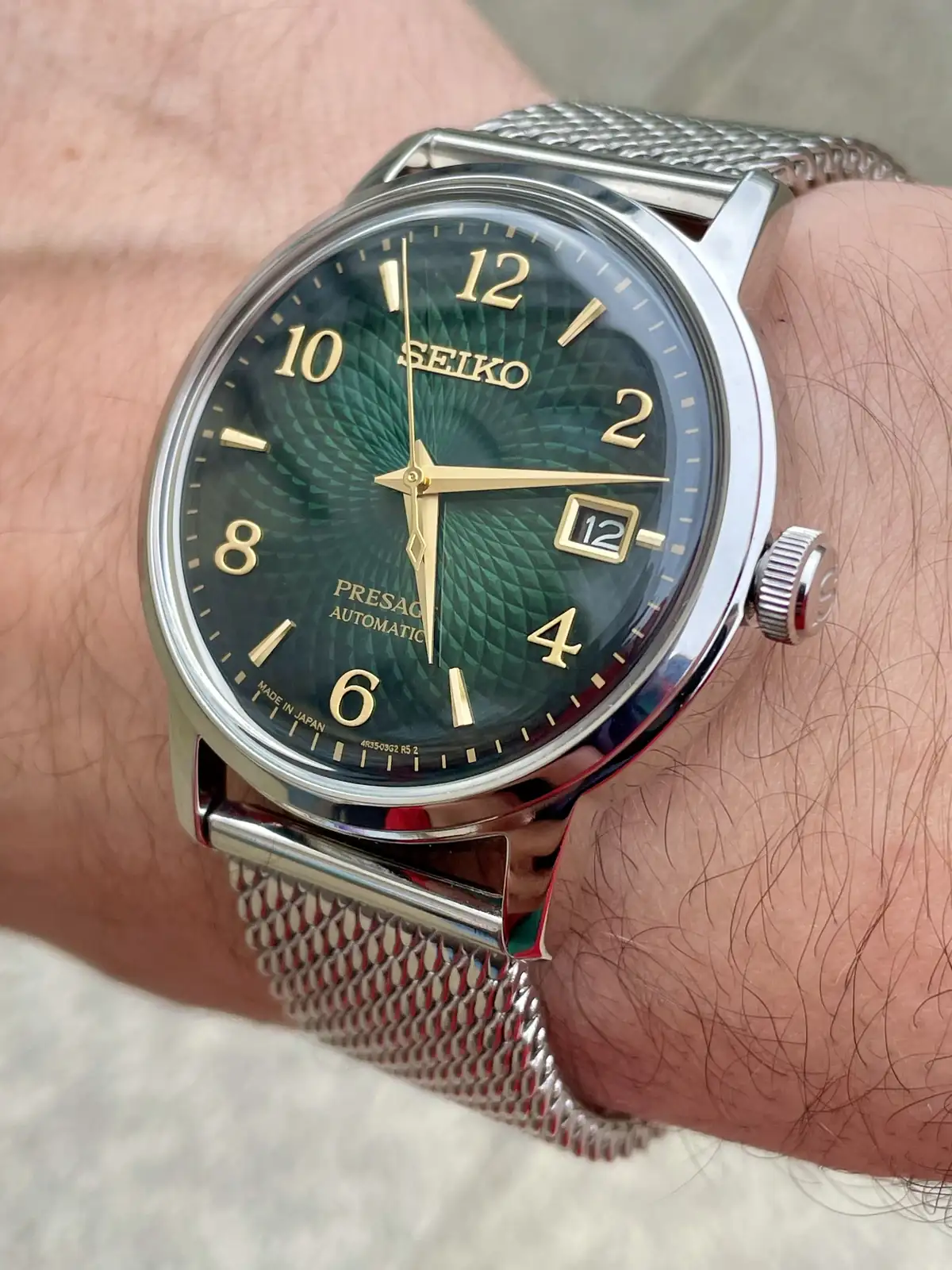 Y así paso la primera tarde de prueba combinándolo con una camisa y zapatillas de tonos verde oscuro, realmente este modelo impresiona mucho en directo y es difícil hacerle fotos donde se observe correctamente la belleza de esfera y de las líneas del mismo, se agracede la corona firmada con la S de SEIKO y el cristal abombado mineral le da un toque de personalidad brutal, los 38,5mm no se hacen pequeños para nada y el lug to lug hacen de este PRESAGE un modelo comodisimo de llevar con una legibilidad muy buena y una sensación de estilo muy acentuada, relación calidad precio pocos relojes tienen esta presencia y esta esfera brutalmente hipnótica 💚