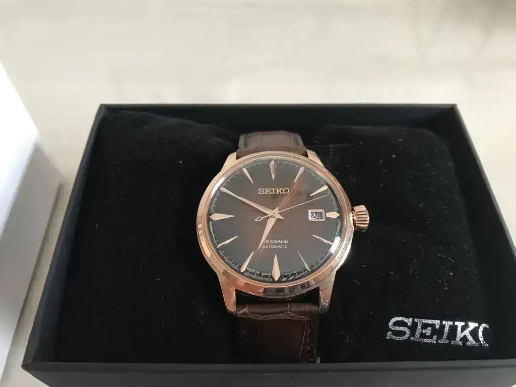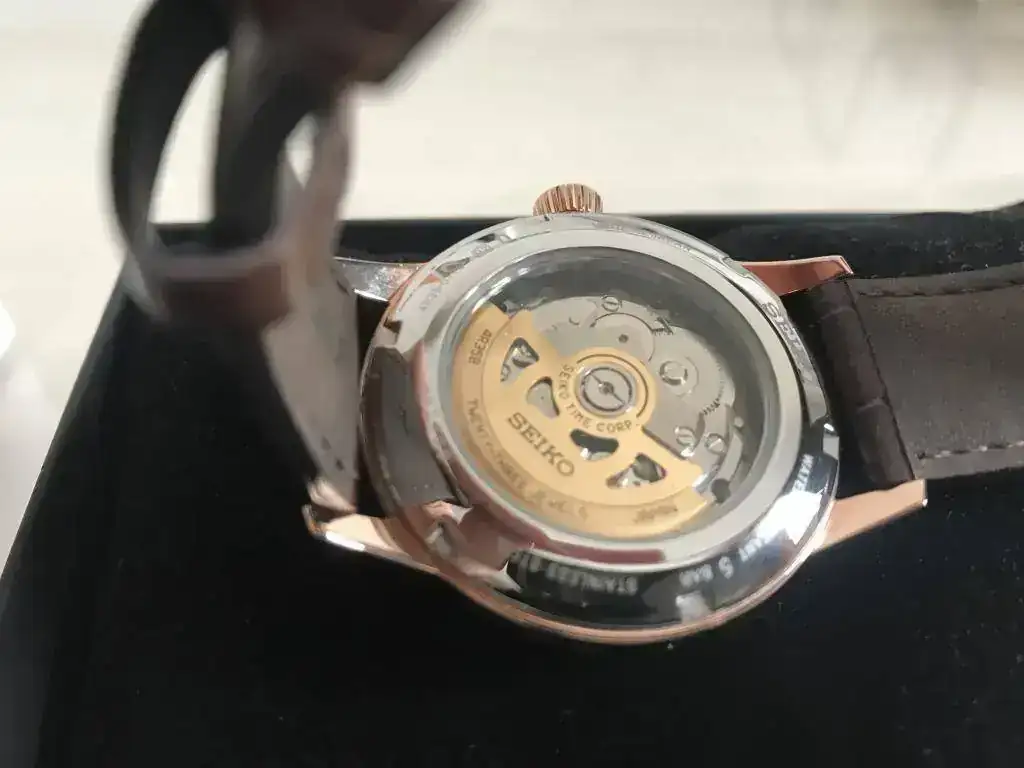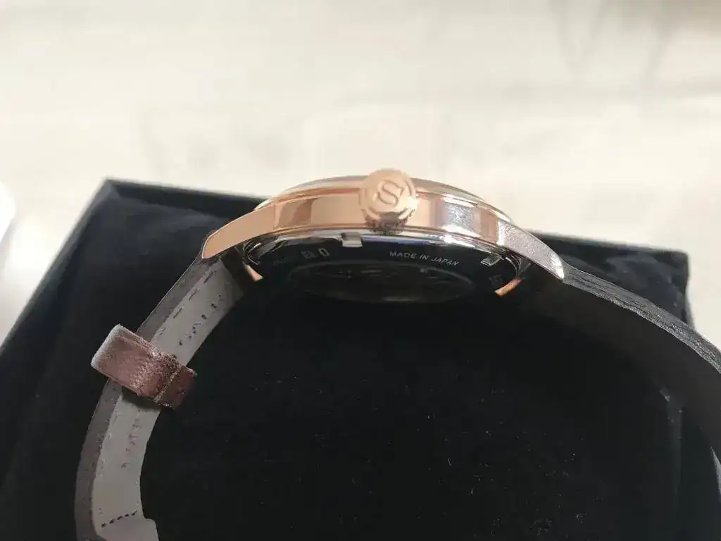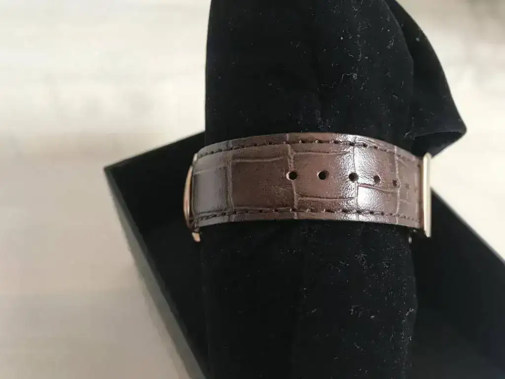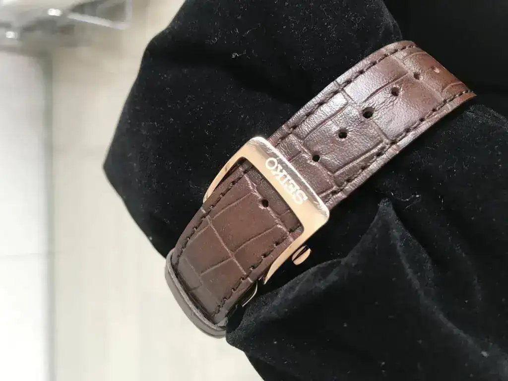 El estado es muy bueno, solo le he visto algunos pelillos en el cierre. Tiene un bonito acabado en acero con tratamiento IP en rosa. Correa de piel de cocodrilo y cierre deployante. Fondo visto.