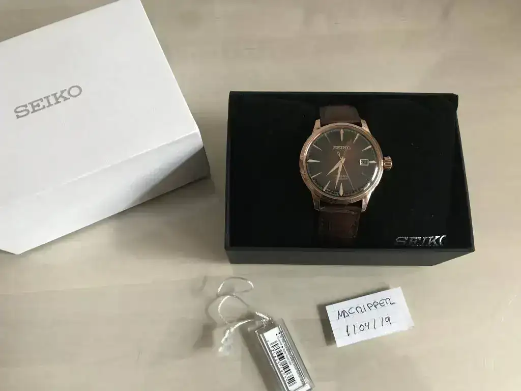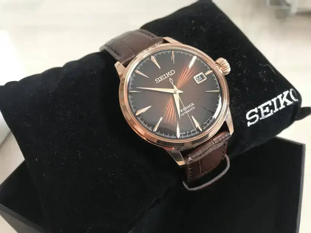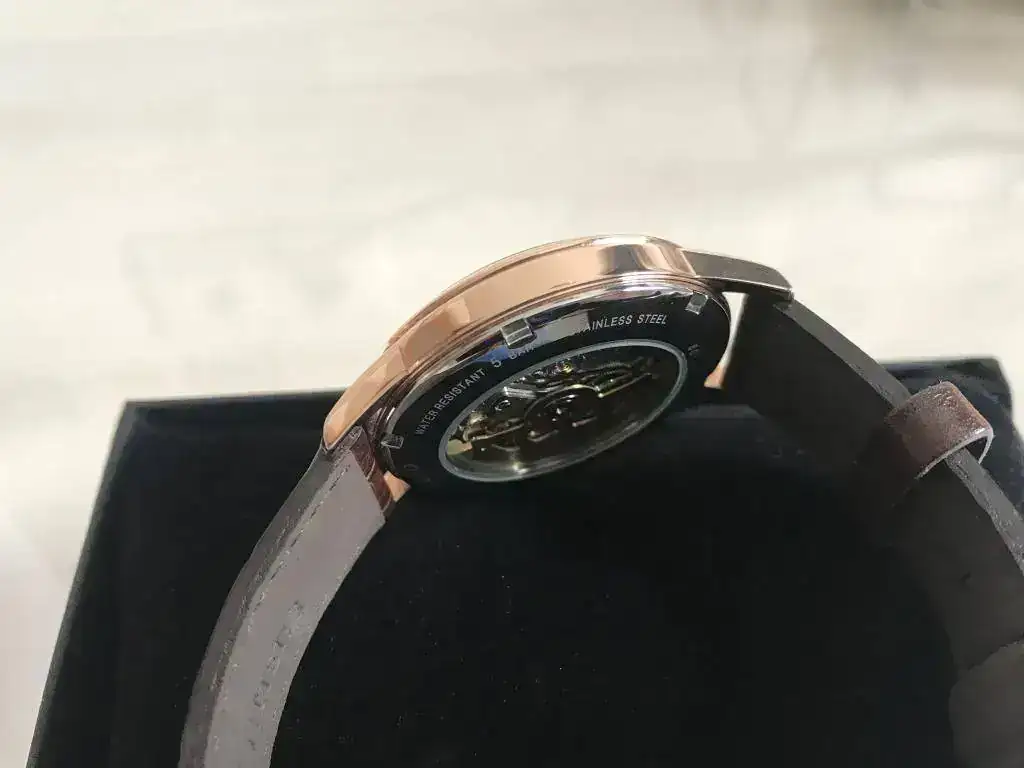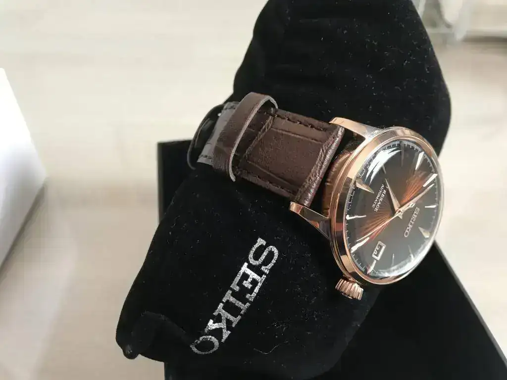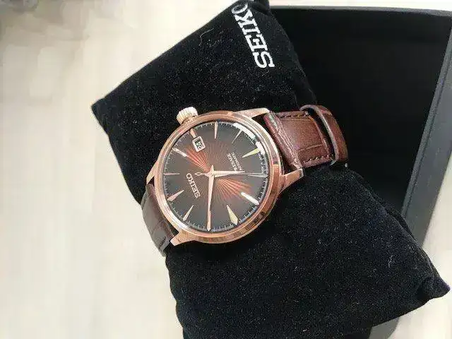 El estado es muy bueno, solo le he visto algunos pelillos en el cierre. Tiene un bonito acabado en acero con tratamiento IP en rosa. Correa de piel de cocodrilo y cierre deployante. Fondo visto.
