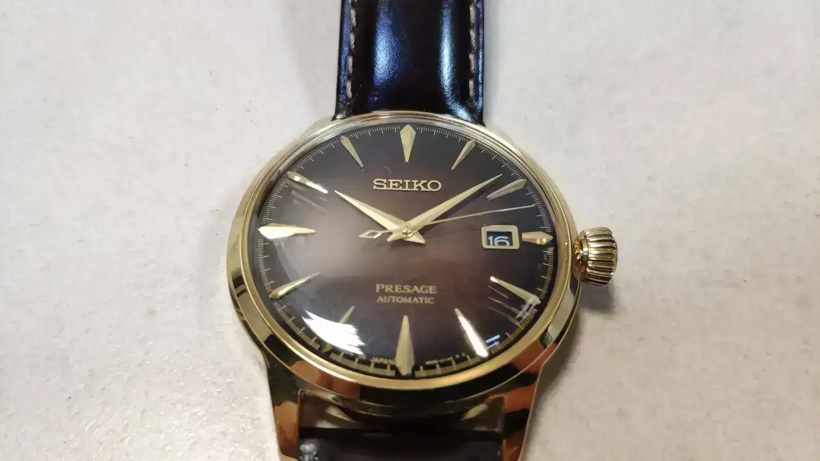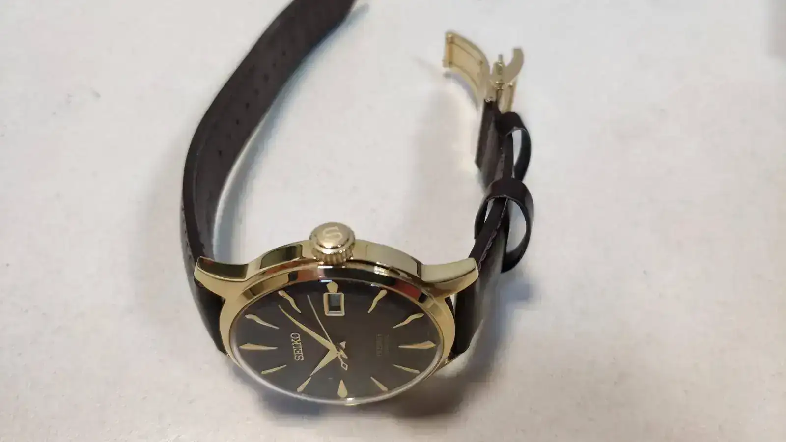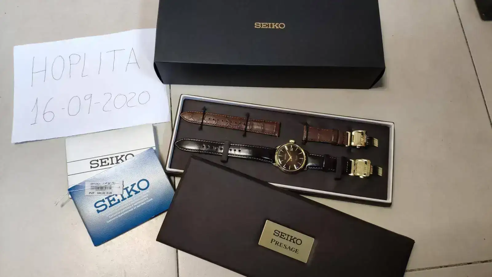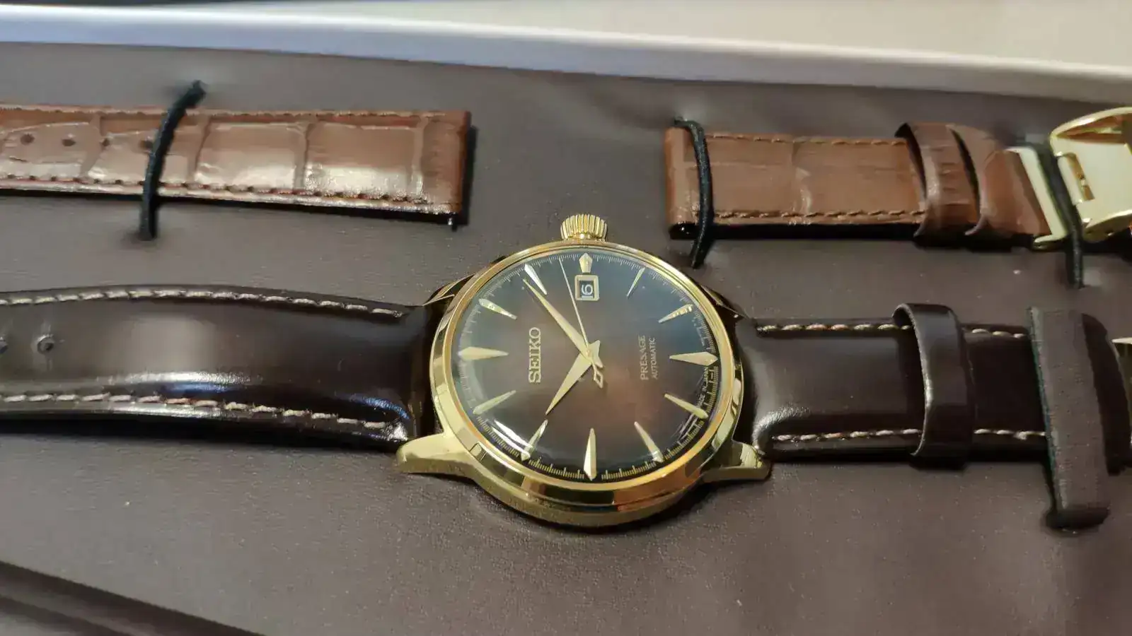 Hola. Vendo este fantástico reloj de Seiko. El reloj está totalmente nuevo, me lo he puesto dos veces, así que de reestreno total y con toda la garantía por delante. Es el modelo cocktail Old Fashioned. Su esfera es espectacular, las fotos que he hecho no le hacen justicia, es de un color marrón suave y dorado texturizado. Es una edición especial y limitada a 8000 piezas y viene con dos correas. La que trae de repuesto no ha sido ni puesta en el reloj.