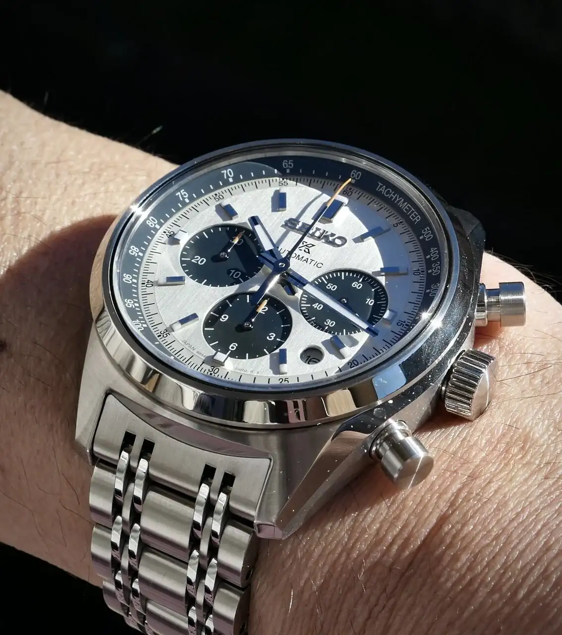 Para los que hablan sin conocimiento de causa, comentarles que me llegó la versión panda hace 10 días, y en cuanto a acabados incluido brazalete lo veo por encima de un reloj como el Omega Speedmaster Moonwatch Professional 3861 ZZ (también lo tengo), un reloj que cuesta 3 veces más y en cuanto a precisión me va clavado, para quien se enamore de él, no tenga “marquitis” ni prejuicios, encontrará un excelente reloj con reminiscencias al pasado de Seiko, con manufactura 100% integrada (el armis del Omega 3861 es made in China por ej…), adjunto foto que le saque.