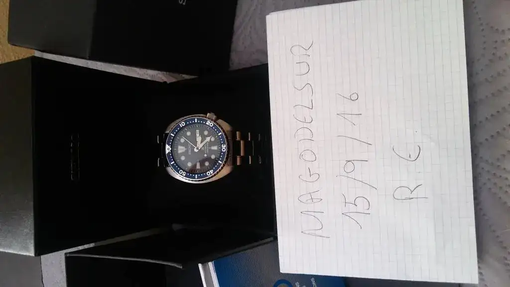 Buenas tardes compañeros, ayer recibí procendente de un mercante del foro el seiko tortuga azul, debido al gran tamaño no me hago con el, lo pongo para venta con un estado de reestreno está impoluto, con garantia hasta 2018, podria aceptar como parte de pago un seiko 007, os dejo las caracteristicas: