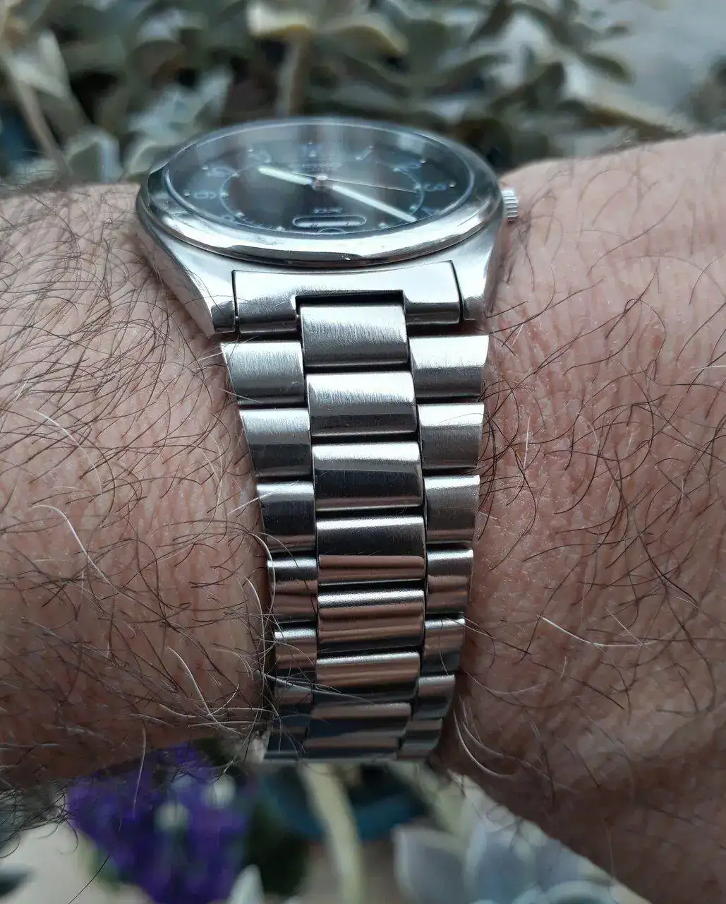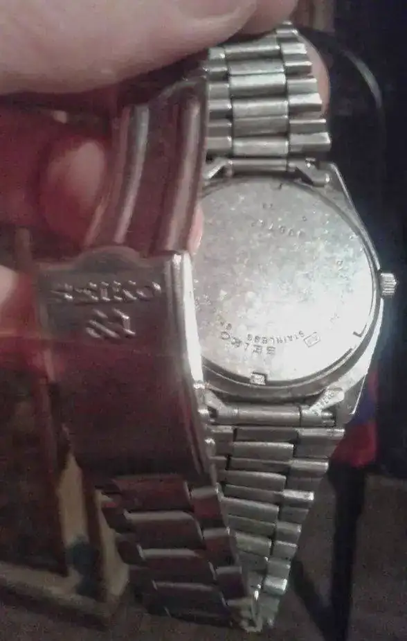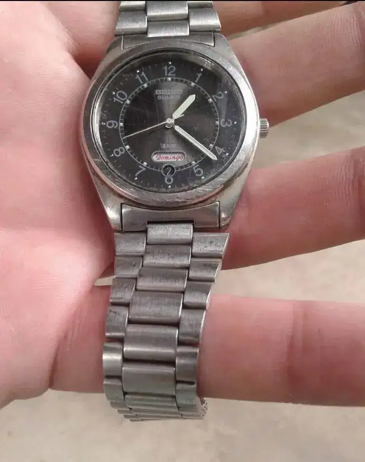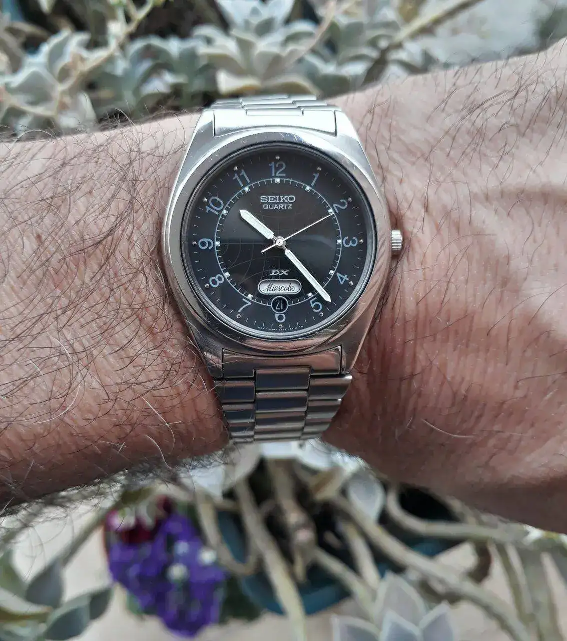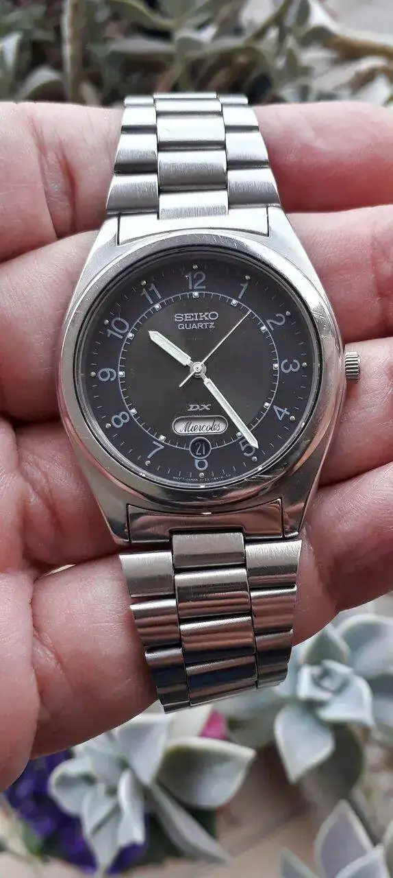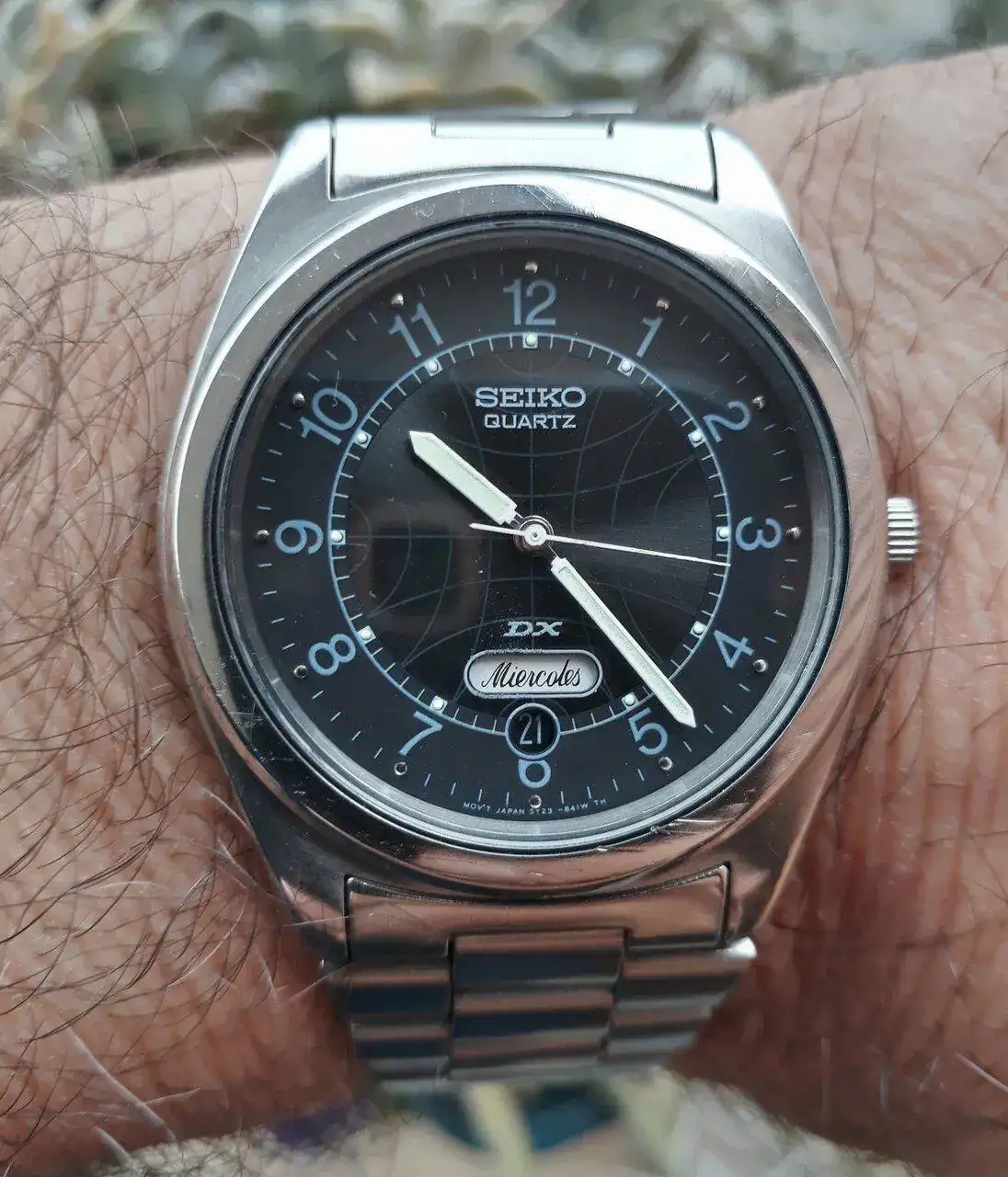 Miércoles con el Seiko Quartz DX movimiento 5Y23 de 1989,con un curioso doble fechadora las 6 ,día de la semana completo en español/ingles con un muy lindo diseño estilografico,cristal Harlex,todo acero inoxidable,original al 100%. Restauración propia.