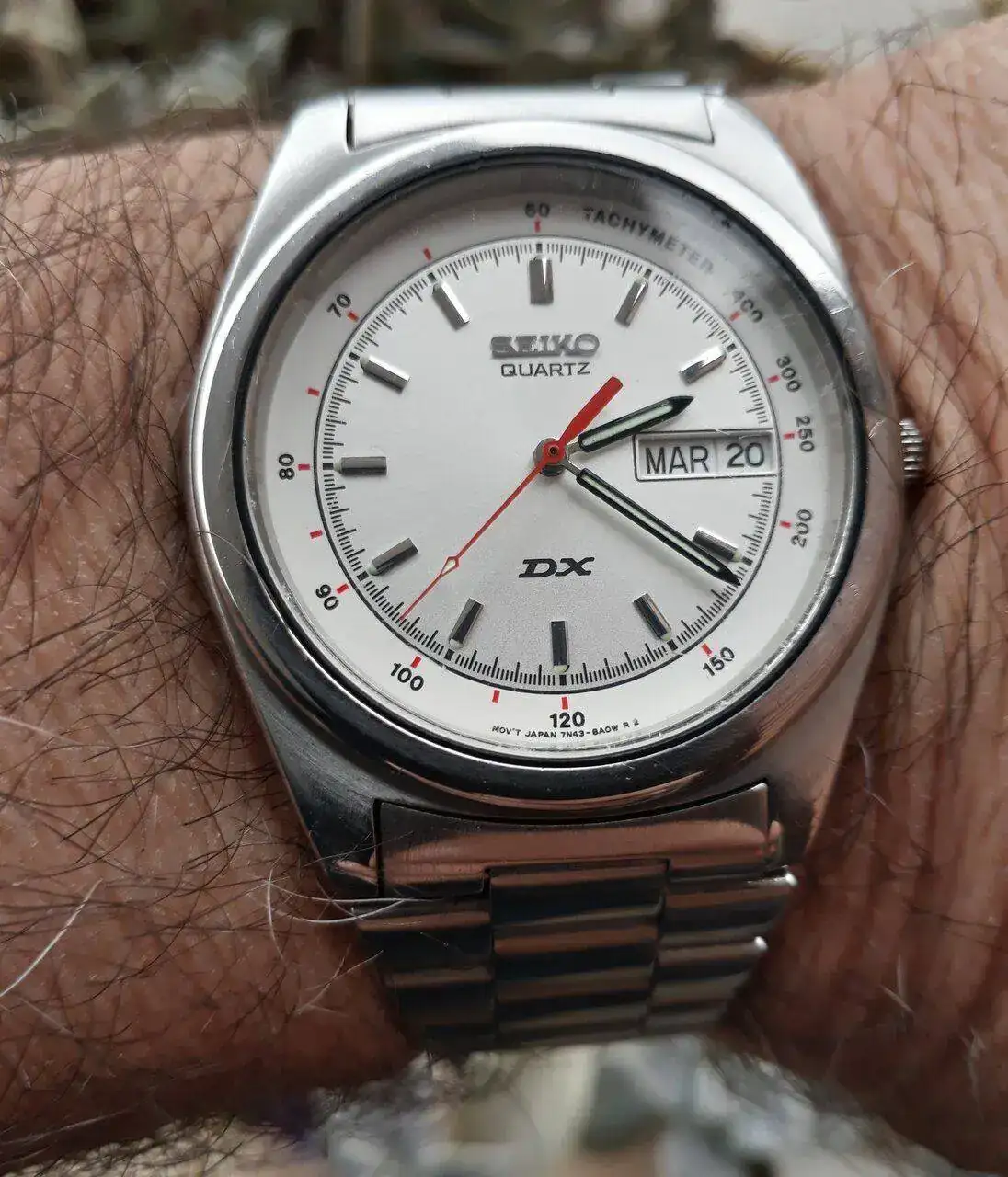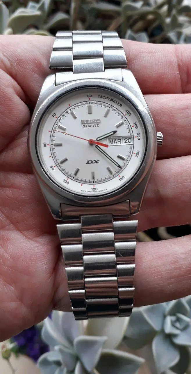 Buen martes para todos,hoy con uno de los mas nuevos de mi colección,el Seiko Quartz DX movimiento 7N45 del año 2002,todo acero inoxidable 100%original,doble fechador a las 3 en idiomas ingles/español,cristal harlex,simulando un tacometro,solo estético. restauracion propia