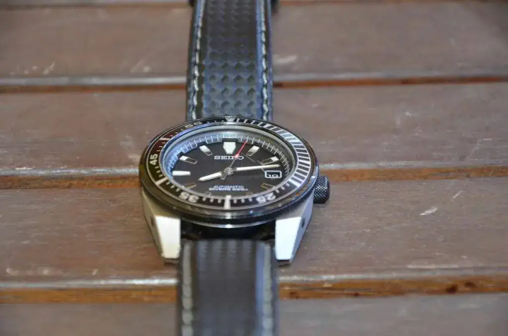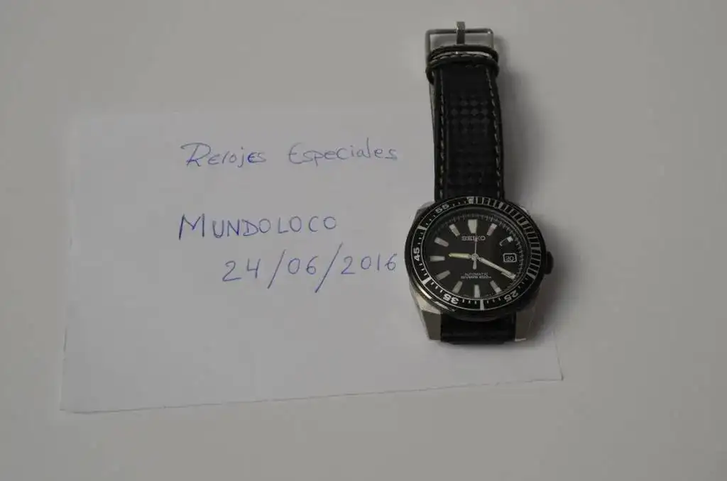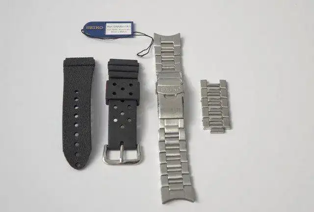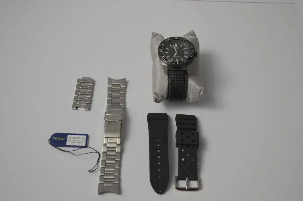 El reloj lo vendo en un lote en el que se incluyen tres correas. La que lleva montada en las fotos, que es una Morellato Tecno-Carbono que opino le queda muy bien; incluyo además el armis original Seiko que traía el reloj (cortado para 17 cm) con el trocito de eslabones sobrante y una correa de goma Z-22 Seiko, fantástica para darle un uso de diver en el verano.