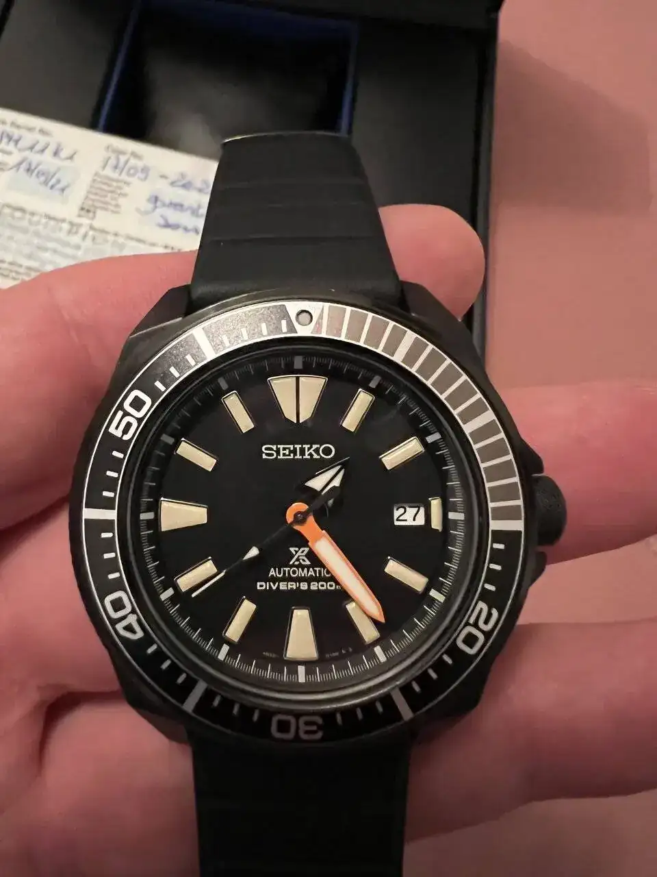 Saco para venta sin cambios este Seiko Samurai en estado prácticamente de estreno puesto en 1 ocasion es una edición limitada y numerada de las Black series que simula el fondo marino cuando los submarinistas se sumergen a altas profundidades con la lámpara, simula los colores que allí se ven con la esfera negra y la aguja naranja