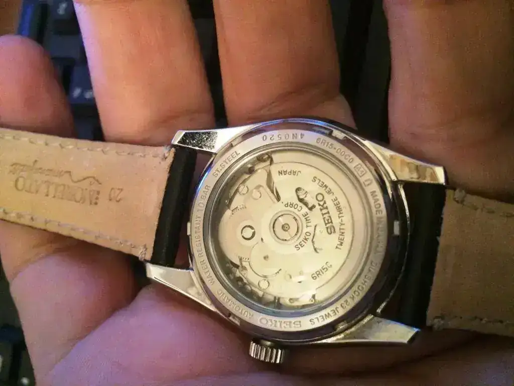 .- calibre de manufactura Seiko 6R15 con calendario con paso rápido y parada de segundero y posibilidad de cuerda manual.