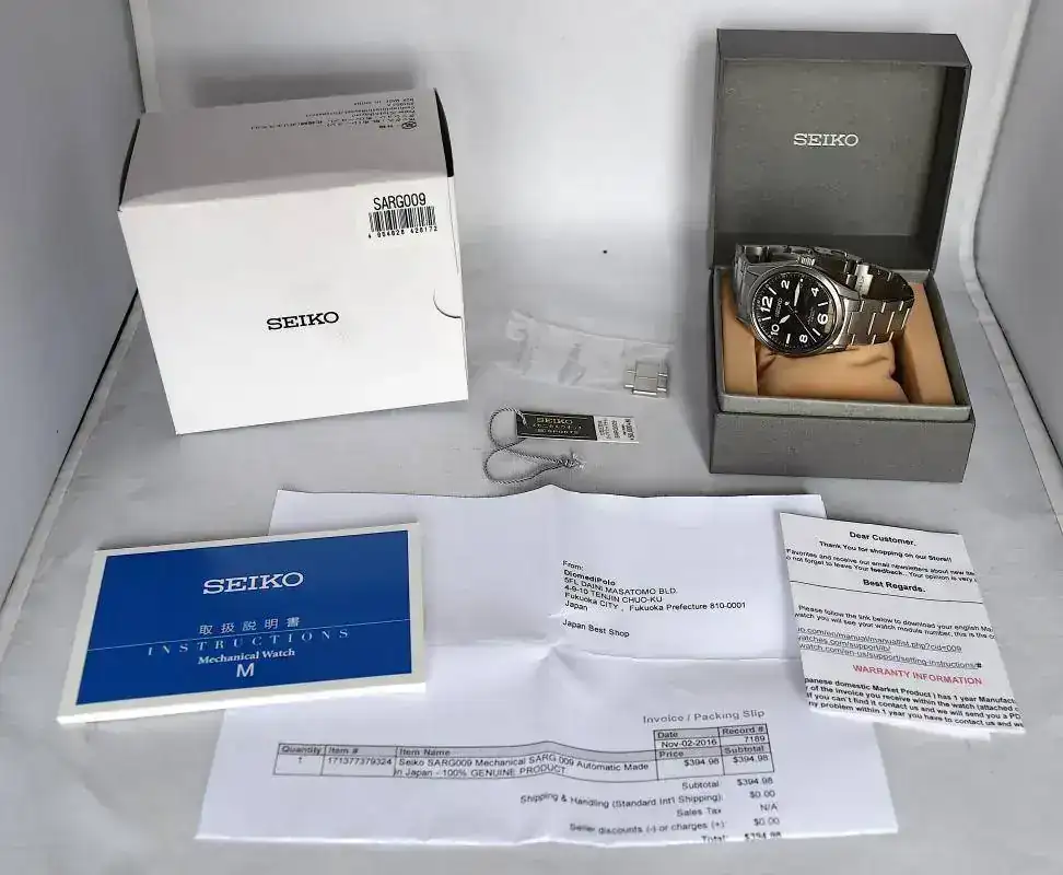 Viene con su set completo, ambas cajas, 2 eslalones, etiqueta, librito instrucciones y la factura de compra mas la garantía Europa del vendedor (no te dan la tarjeta de Seiko ya que solo es valida en Japón)