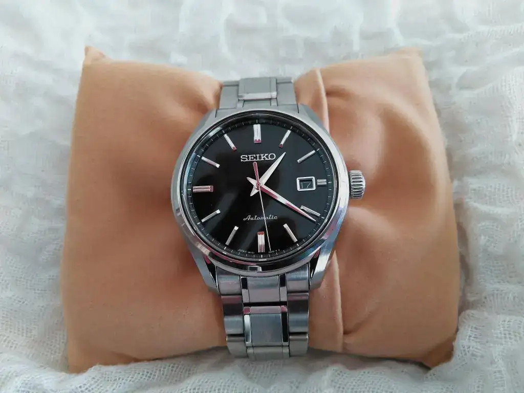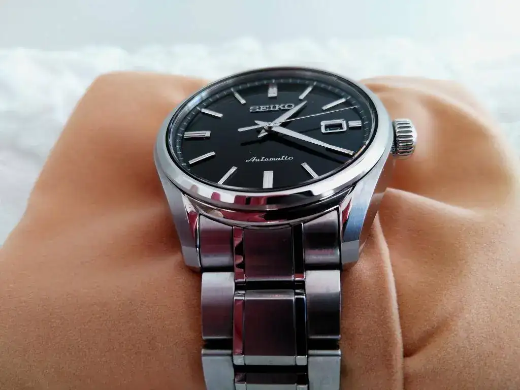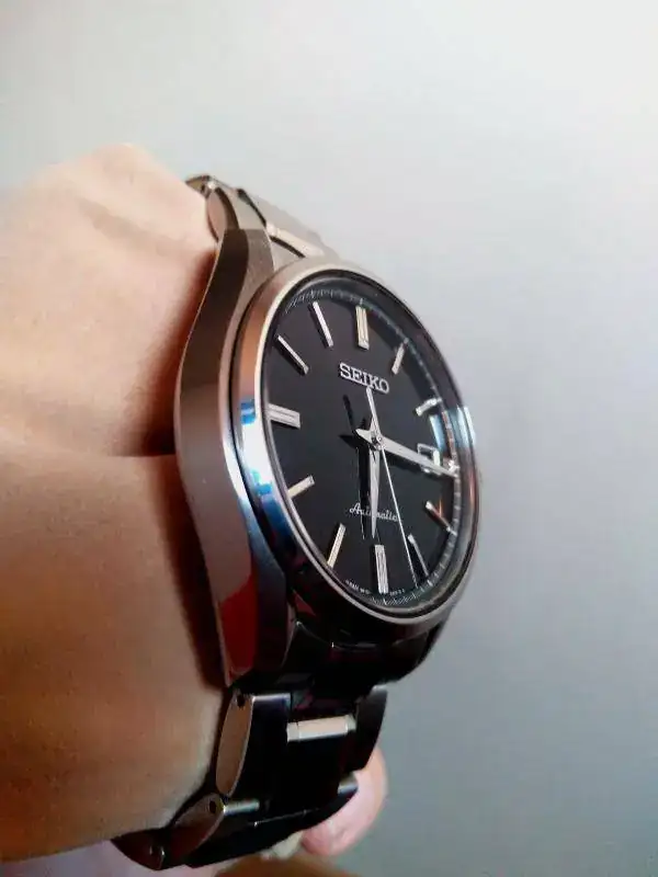 Caja preciosa con una carrura pulida y asas tipo GS. La caja es de 41mm por lo que es un reloj que tiene mucha presencia y elegancia. Seiko cuidó mucho el Lug to Lug dando unos impresionantes 46mm y haciéndolo super cómodo. Brazalete de mucha calidad y muy bien acabado, es de 20mm y en el cierre acaba en 18mm, para mi gusto muy elegante también. Ambos elementos están tratados con DiaShield, que es una aleación especial que los hace 2-3 veces más resistente que el acero. Cristal con doble AR que es una auténtica pasada y que hace resaltar el dial negro, agujas e índices. El calibre es un 6R15 que viene muy bien ajustado en +2 segundos/día, con una reserva de marcha de más de 50 horas. Corona firmada con la S de Seiko. Fondo de visto con cristal Hardlex. En mi opinión, es un reloj que de tener otra denominación de origen costaría el doble.