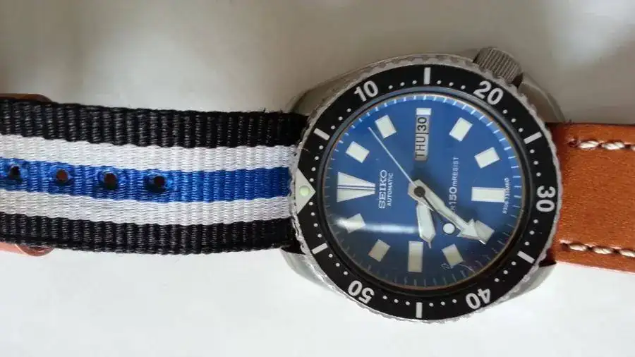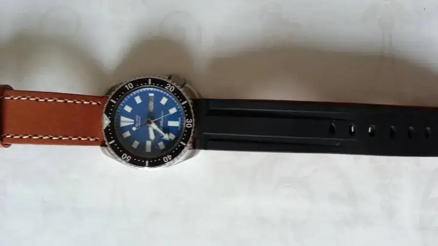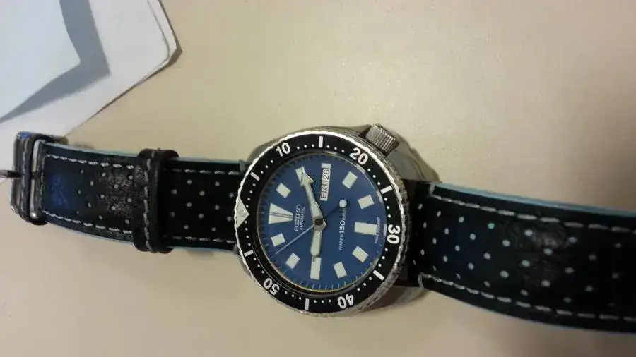 Incluyo con el reloj un armis SuperJubilee Seiko de eslabones macizos y atornillados, así como los end links. No tiene la menor marca. Además, una correa original Seiko Z22 sin estrenar, una nato a juego con el reloj y una correa de cuero con puntos celestes.