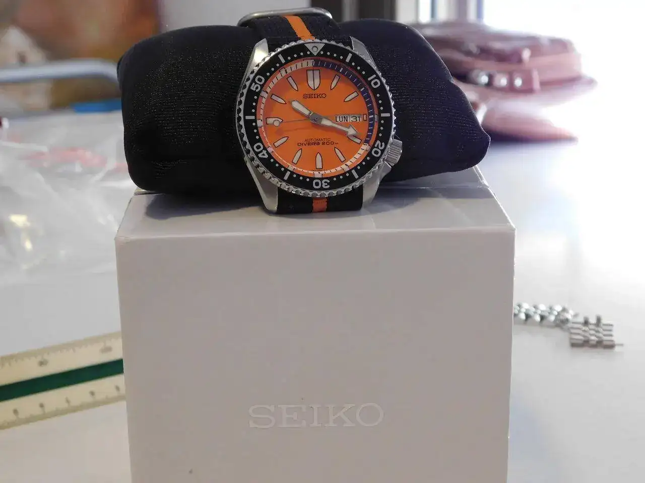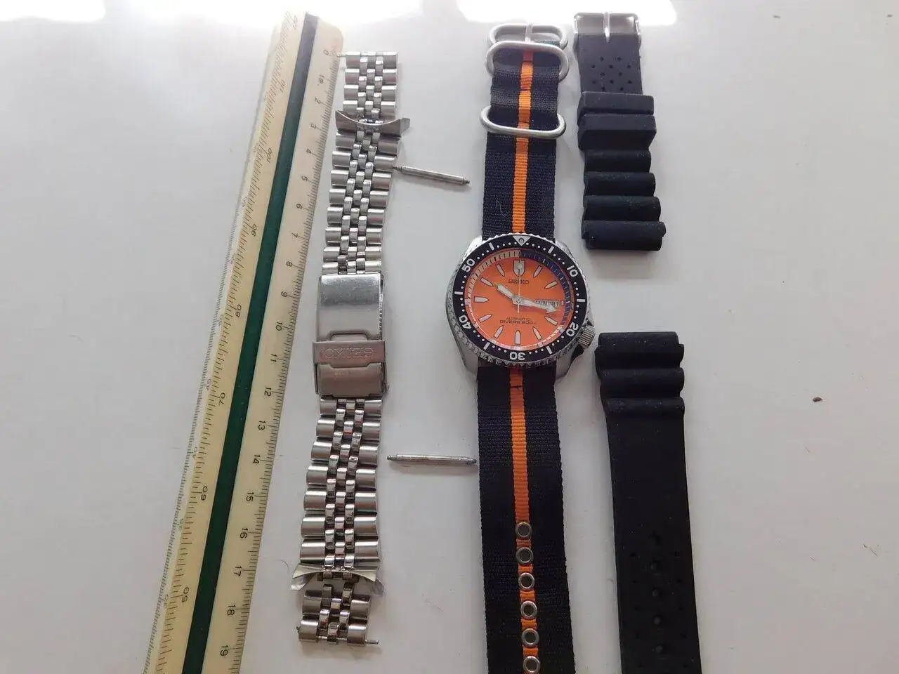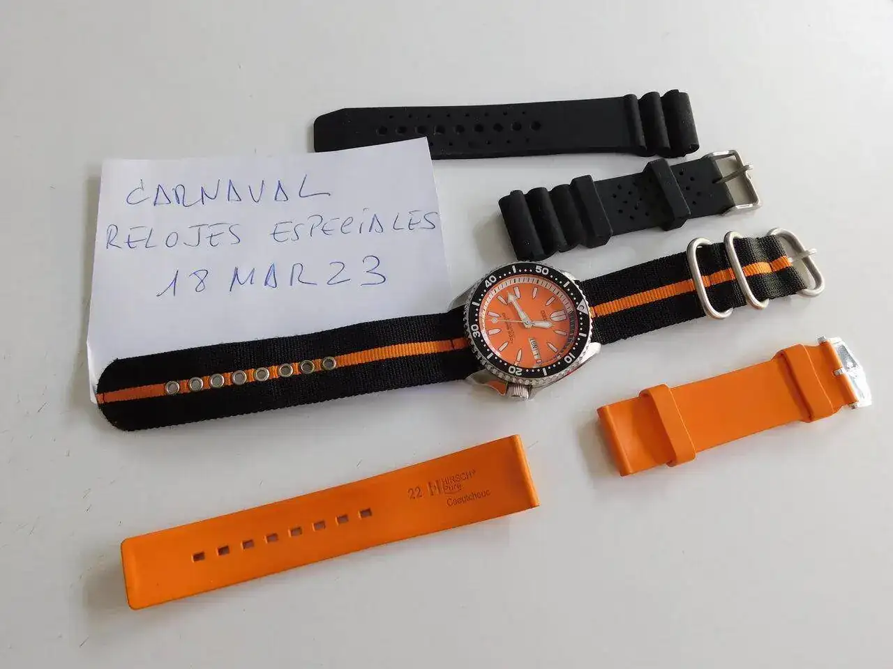 Se lo compré a un holandés en TZ-UK. Venía con el brazalete de acero Seiko y la correa de ¿caucho? negra sin marca que nunca usé (creo que está sin usar). Yo compré la de caucho naranja y la de nylon, ambas Hirsch, que creo que le quedan mejor y son las que he usado.