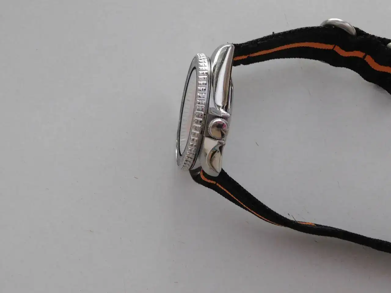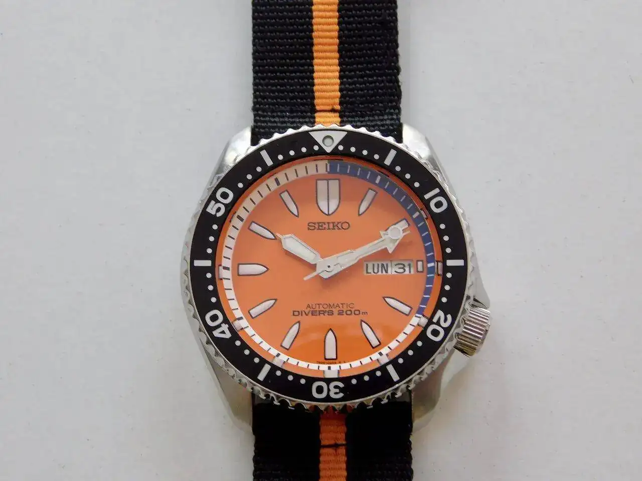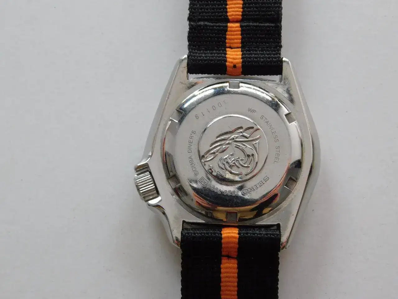 Se lo compré a un holandés en TZ-UK. Venía con el brazalete de acero Seiko y la correa de ¿caucho? negra sin marca que nunca usé (creo que está sin usar). Yo compré la de caucho naranja y la de nylon, ambas Hirsch, que creo que le quedan mejor y son las que he usado.
