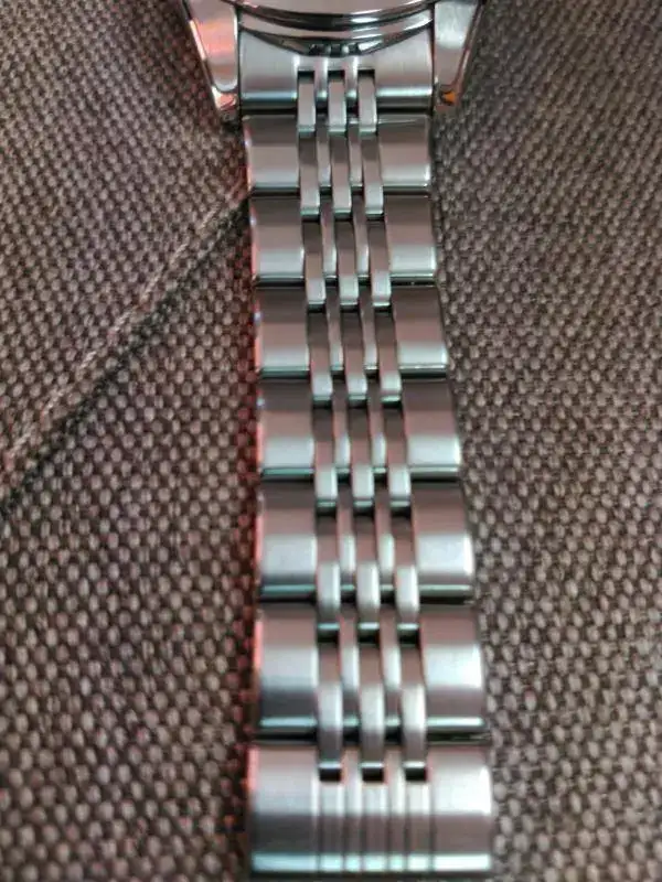 38 y pico milímetros sin corona, 100 metros, automático, cuerda manual, parada de segundero, zafiro, brazalete end links macizos (todos los eslabones).