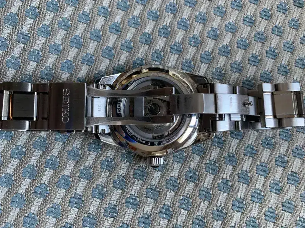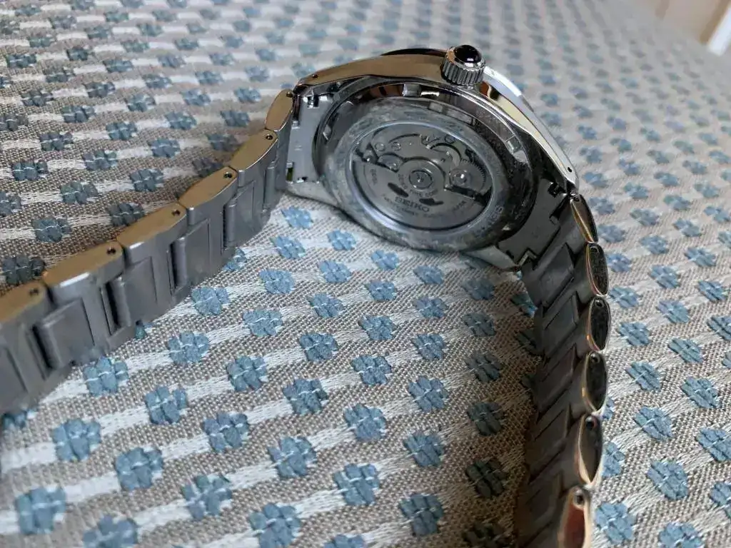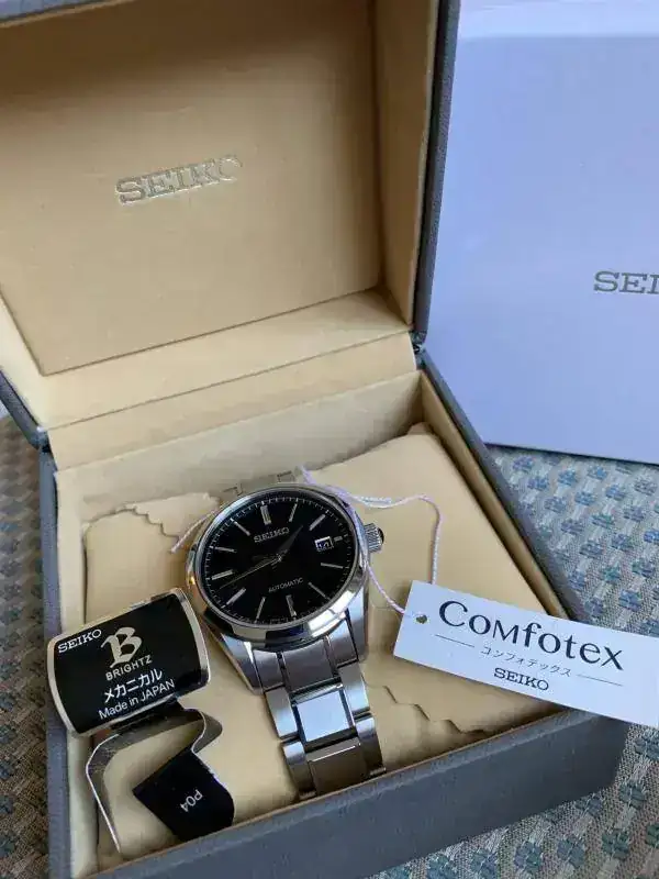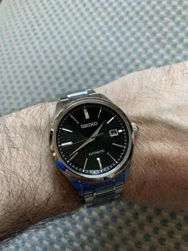 Seiko de la gama Brightz, la cual en mi opinión está en acabados sólo un paso por debajo de GS. Este modelo en concreto tiene una esfera negra texturizada en forma de rayos de sol que es impresionante. Un buen zafiro antireflejos y el conocido y fiable calibre manufactura Seiko 6r15.