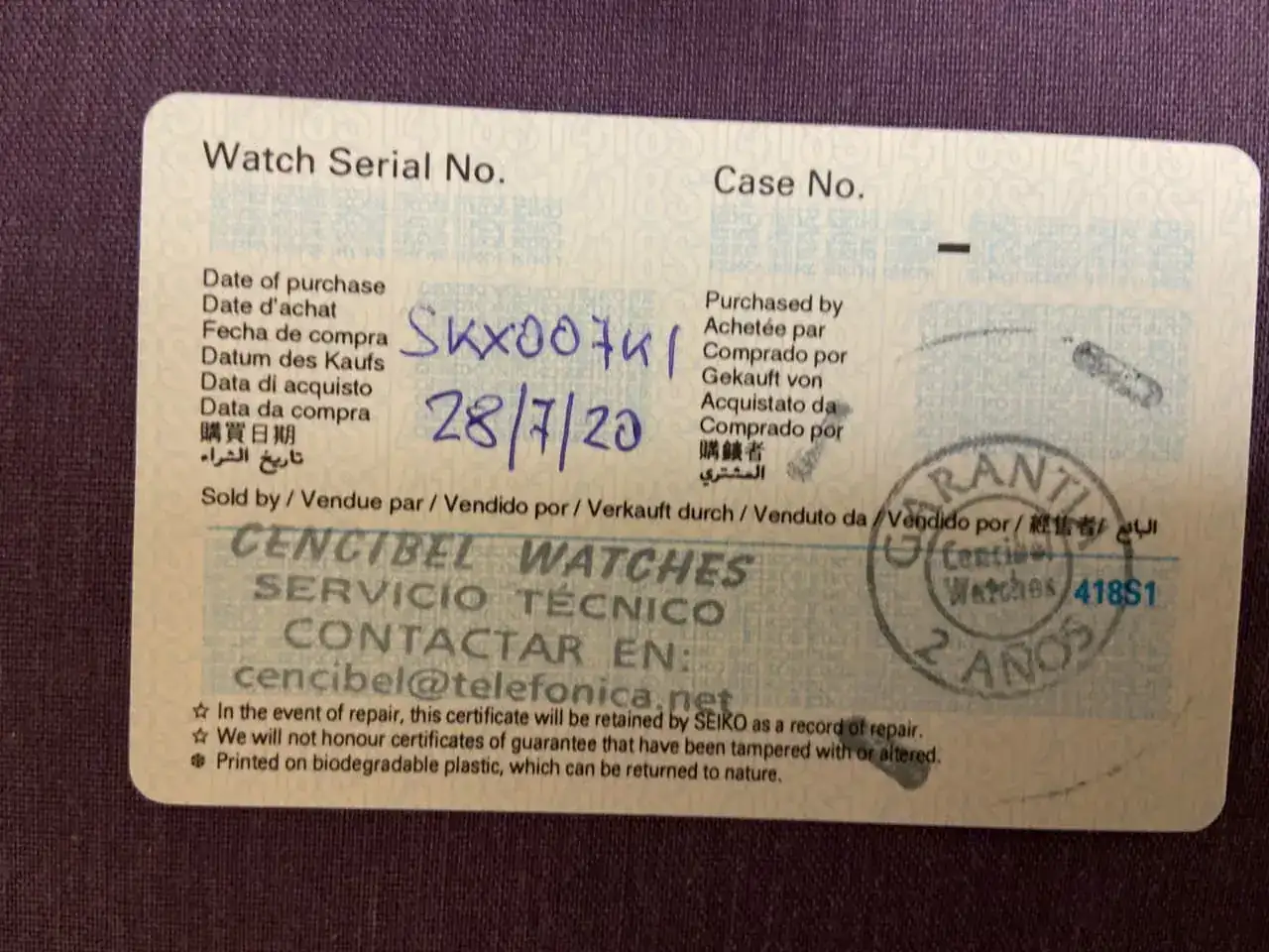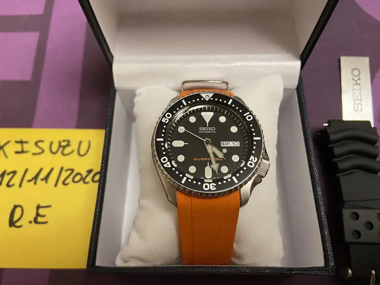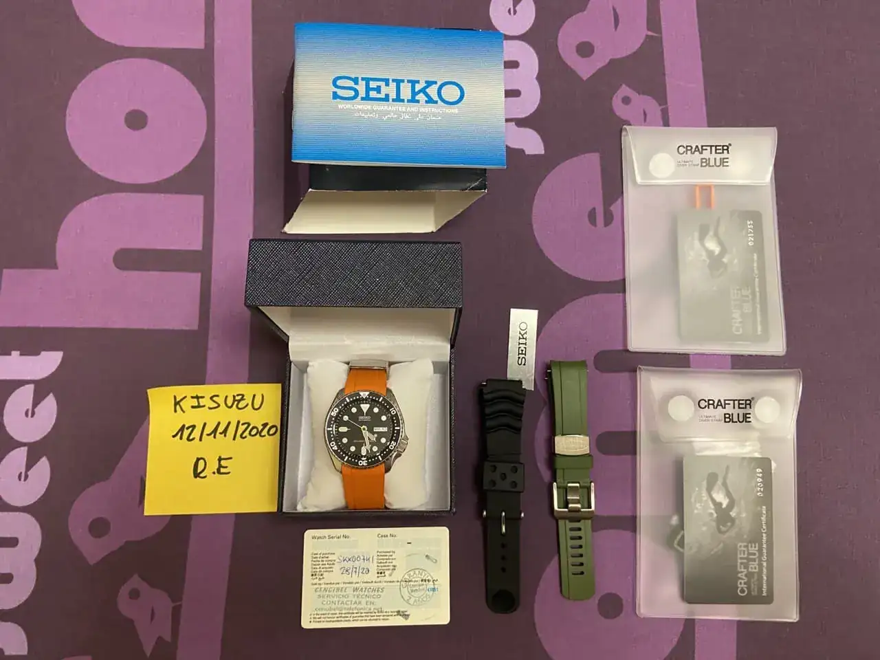 Vendo Seiko SKX007 K2 con 3 meses y medio de antigüedad. Cuenta con su garantía original puesto que ha sido comprado a mercante del foro. Es la versión que lleva caucho en origen, al que además añado un segundo caucho idéntico al original que no aparece en las fotos y 2 cauchos Crafter Blue naranja y verde -este último con una sola puesta, el día de su compra-. Estado prácticamente perfecto, sin golpes ni arañazos en ninguna parte, mínimos pelillos únicamente en el lateral izquierdo que solo se aprecia al trasluz. Inferior de la caja impoluta. El reloj lo vendo porque en mi caja de 8 piezas ya no tiene hueco debido a la reciente compra de su hermano 009; me lo he puesto 7 veces y ha sido tratado con el máximo cuidado, ni tan siquiera tiene roces en las asas al cambiar los cauchos. El precio son 310€ con envío certificado incluido, solo las dos Crafter Blue nuevas ya cuestan 120€ y el segundo caucho original Seiko otros 25€. Vendo todo el pack junto y no me interesan cambios.