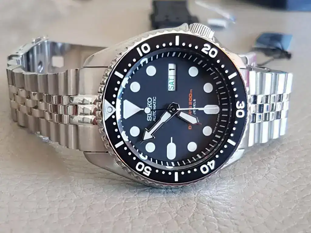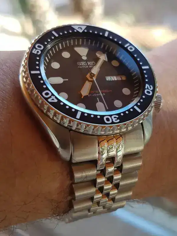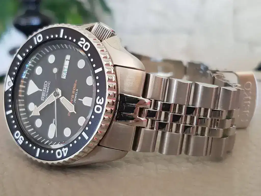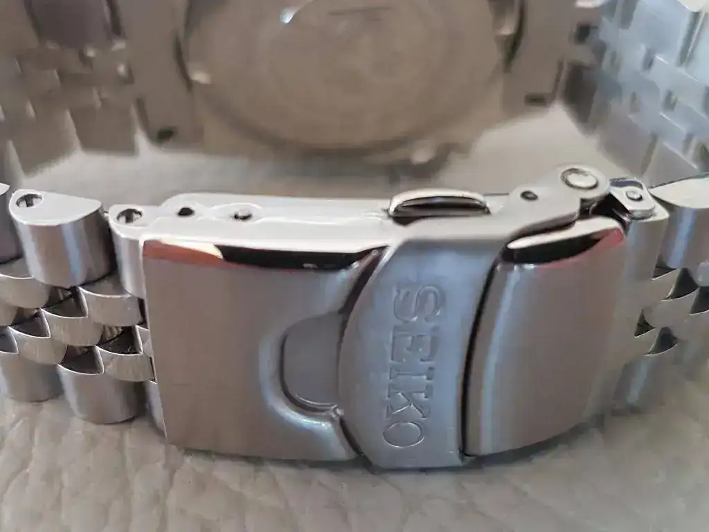Para vestir el reloj, brazalete (aftermarket) Jubilee de eslabones sólidos y atornillados. Con Solid End Links y cierre Seiko.