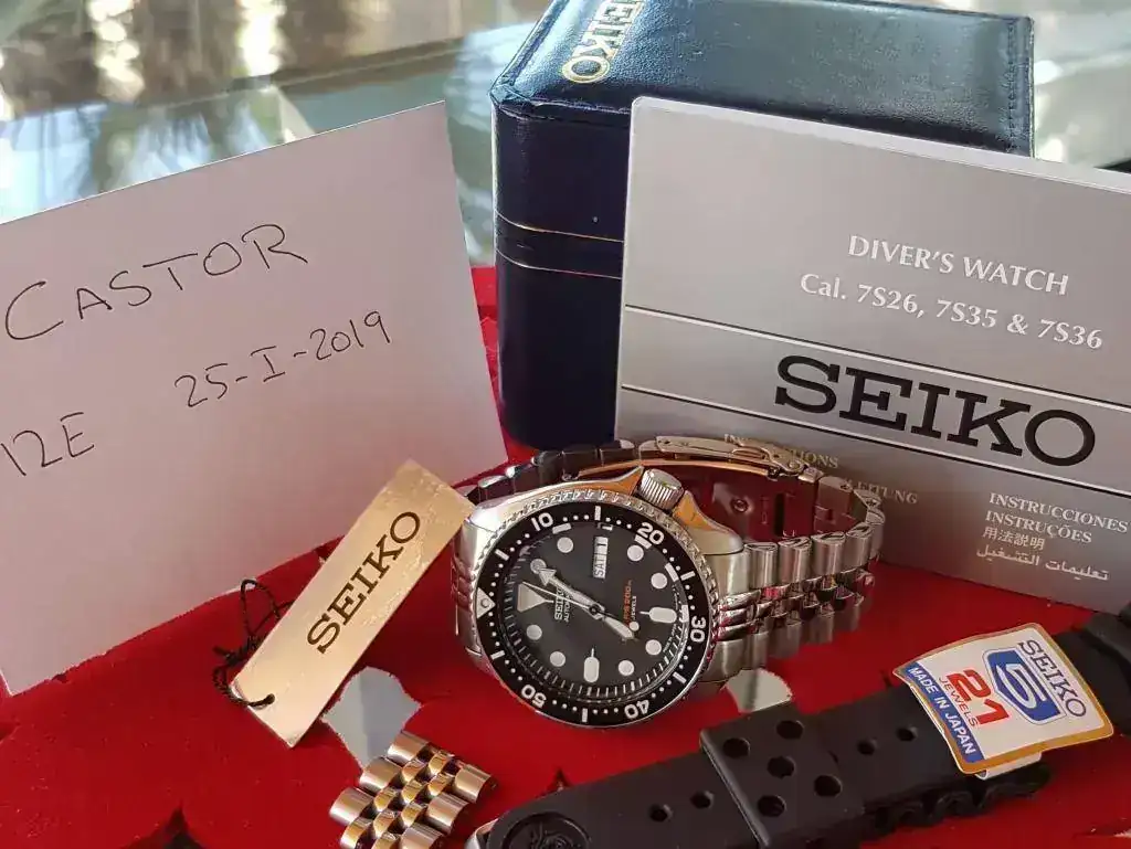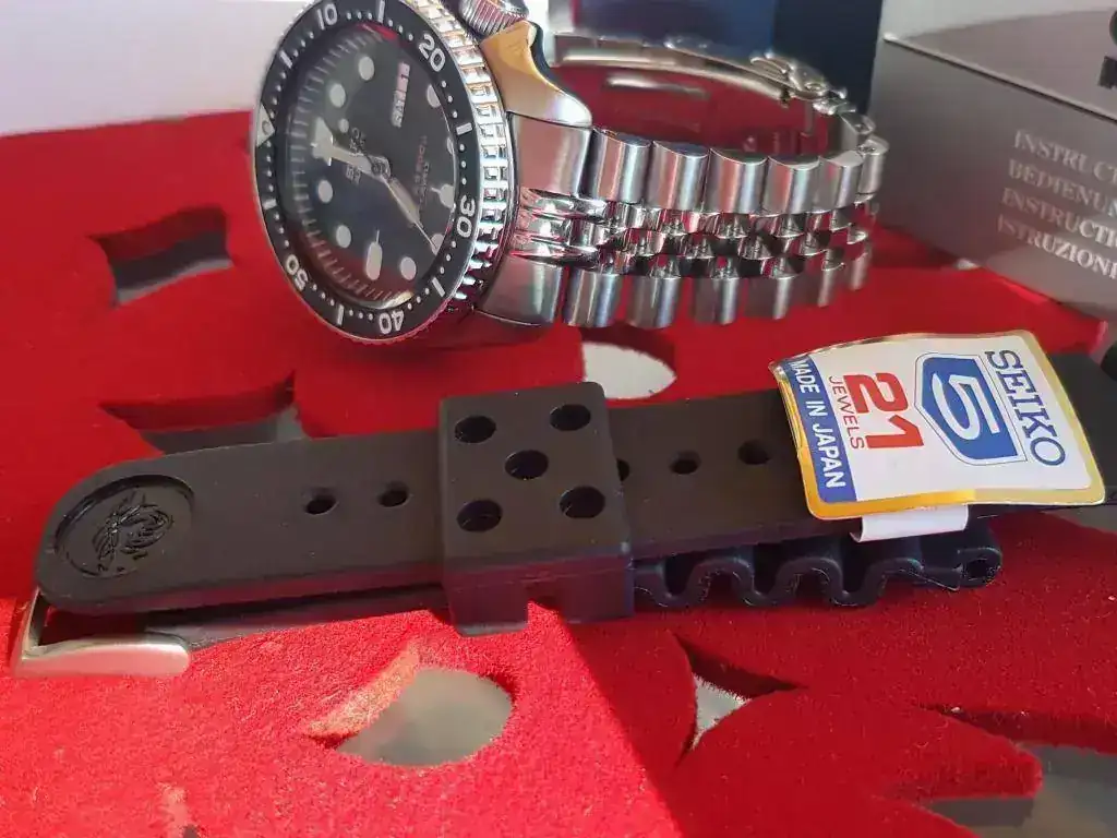 También se adjunta la correa de caucho de Seiko con la ola de Kanagawa en la pieza larga y la hebilla de acero mate firmada en el interior.