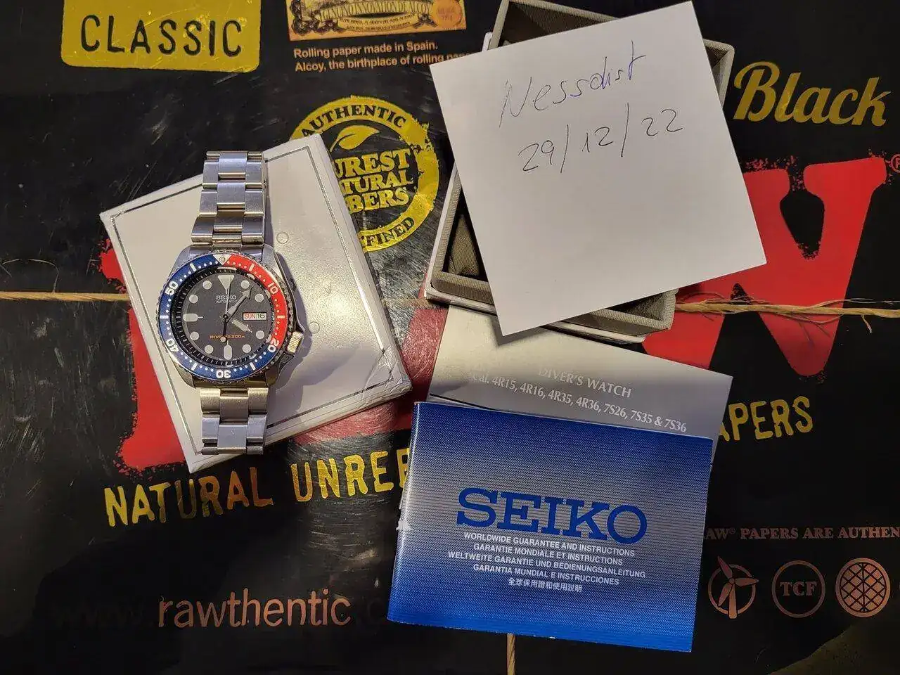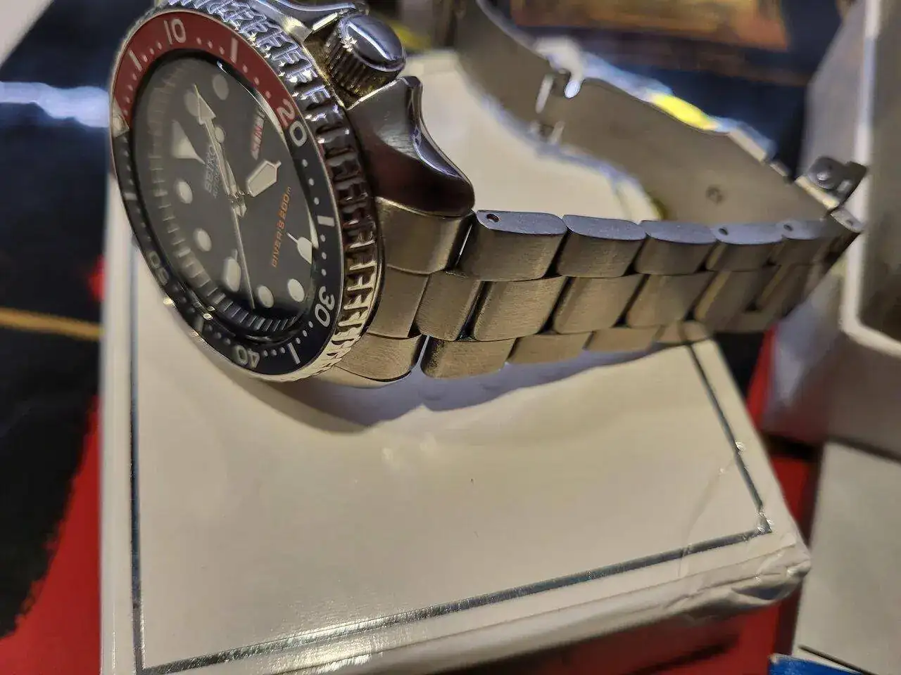 Lleva un armis oyster para 007/009, que se adapta cómo un guante, con sus signos de uso evidente. El insert del bisel tiene una pequeña marca a las 12 que no se aprecia mucho en vivo, pero está, ya que si no me falla la memoria, se le despegó el circulo que lleva el bisel hace ya tiempo