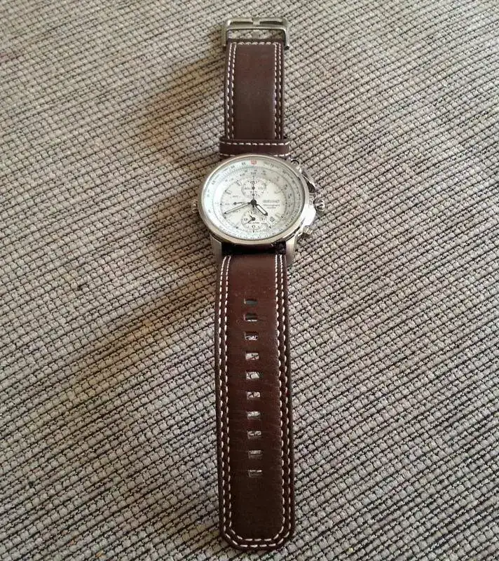 Ademas cuenta con bisel giratorio bidireccional movido por la corona de la izquierda. Alarma. Cronometro, con un pulsador superior de interesante diseño. Calculos de navegación. Conversión de medidas: millas, km, galones, raiz cuadrada. Puede calcular conversiones y rendimientos de combustible, cálculos de Ascenso, e incluso puede calcular la posición considerando los efectos de vientos cruzados a tu avión. Suma, resta, multiplica y divide. WR 100m. Es un reloj precioso, con unos pulsadores del crono tremendamente exclusivos, y con una corona a la izquierda que permite girar el bisel flightmaster, con todo un manual para la gran cantidad de funciones que lleva.